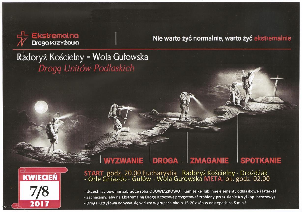 START: 7 kwietnia godz. 20.00 Eucharystia - Radoryż Kościelny - Drożdżak - Orle Gniazdo - Gułów - Wola Gułowska - META: ok. godz. 2.00