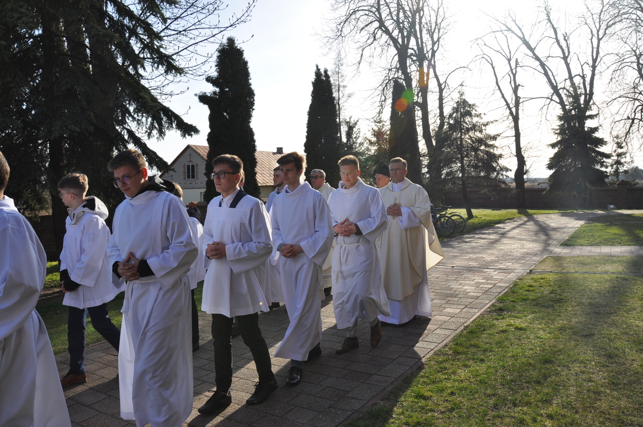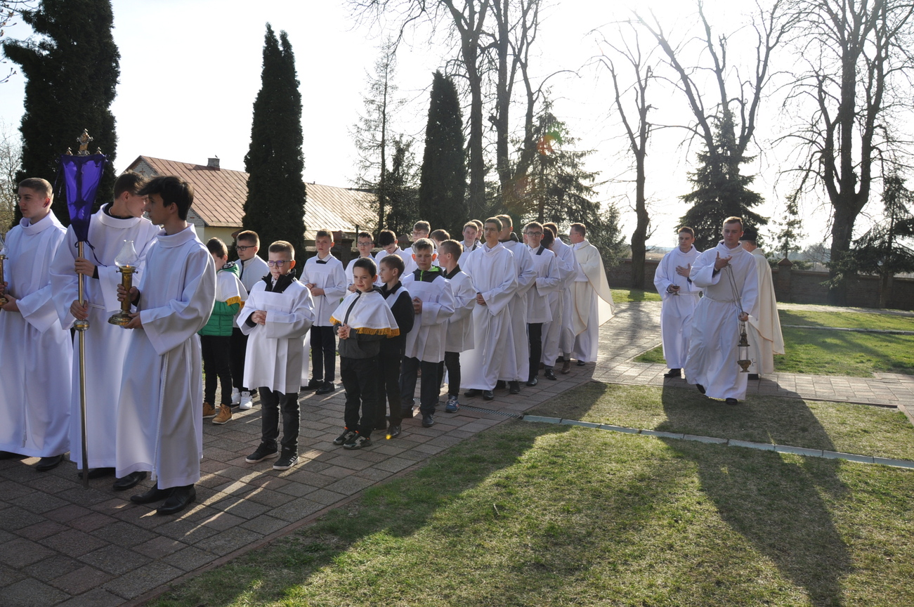Dnia 14 kwietnia rozpoczęliśmy obchody Triduum Paschalnego. Wielki Czwartek przypomina Nam ustanowienie Eucharystii i  sakramentu kapłaństwa przez Jezusa Chrystusa. W dzisiejszej Ewangelii słyszymy o tym jak Pan Jezus obmywa nogi swoich uczniów, co jest znakiem pokornej miłości do bliźniego. Delegacja z Naszej parafii złożyła życzenia i podziękowania za posługę księżom posługującym w Naszym parafialnym kościele.