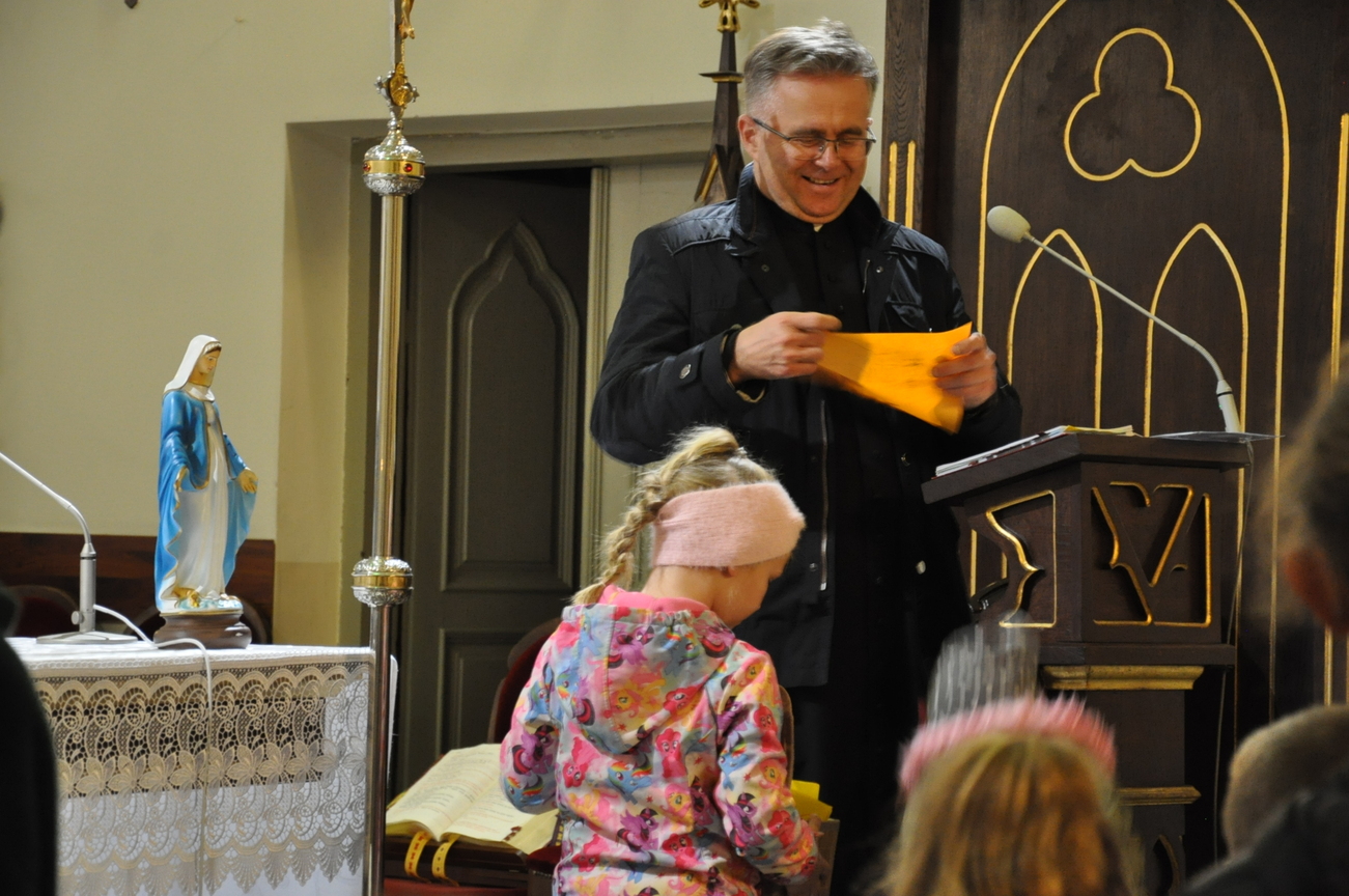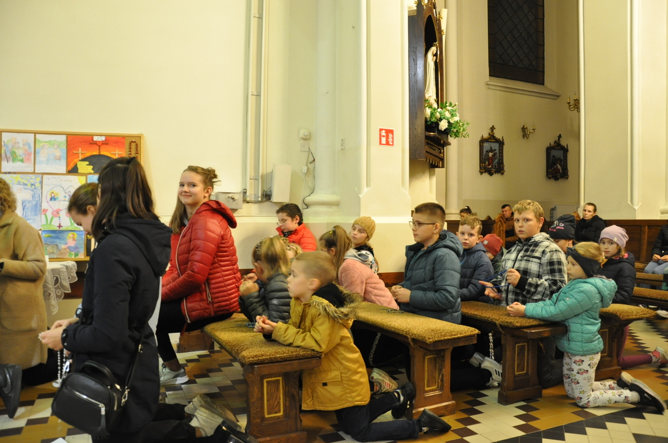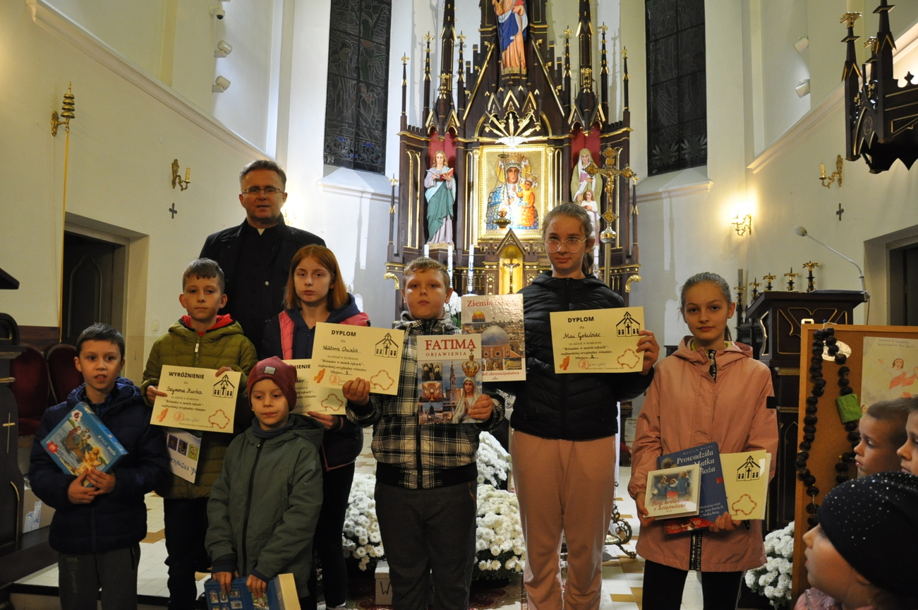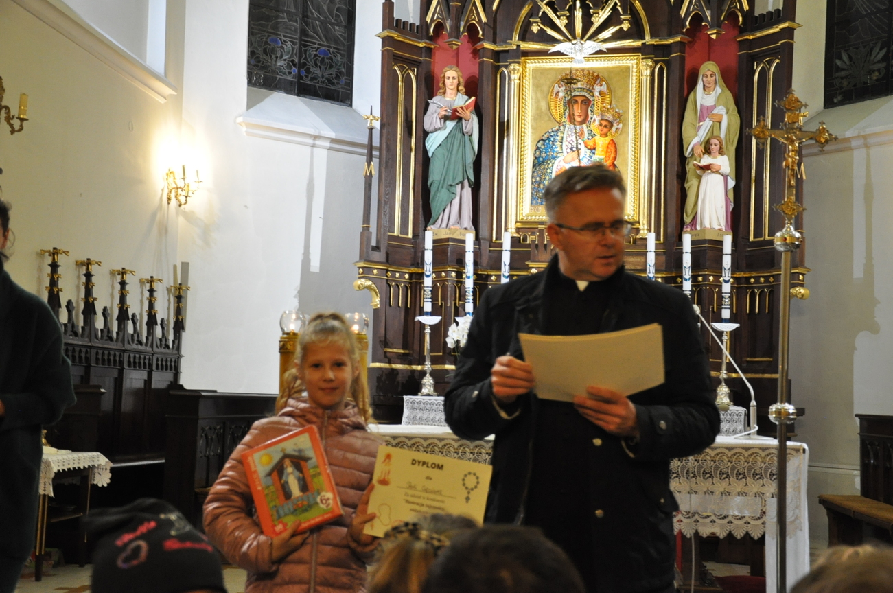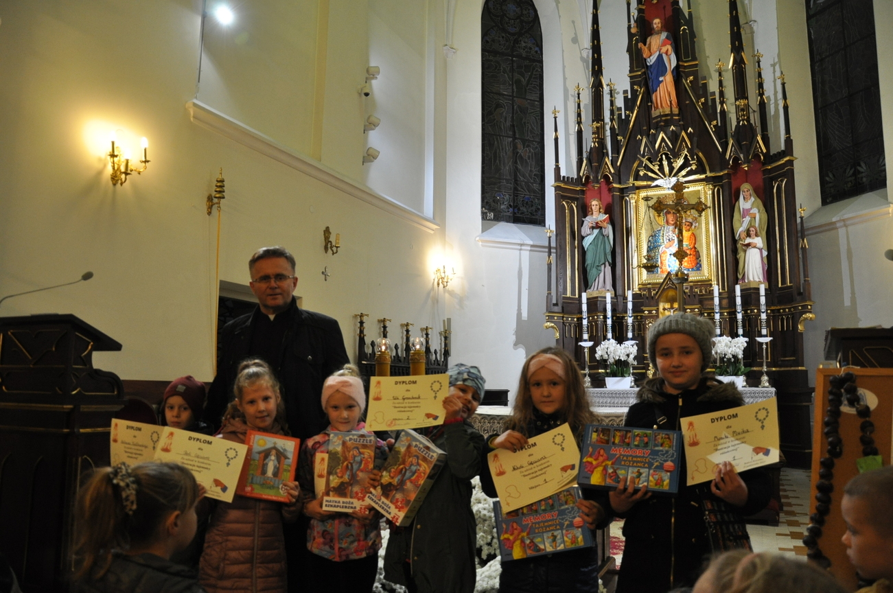 31 października 2022r. po Mszy św. o godz. 17.00 i ostatnim w tym roku nabożeństwie październikowym odbyło się podsumowanie i sprawdzenie uczestnictwa najmłodszych parafian w modlitwie różańcowej. Tego dnia zostały rozdane nagrody tym dzieciom, które wytrwale modliły się na różańcu w świątyni przez cały miesiąc. Został również rozstrzygnięty konkurs, którego celem było wykonanie własnoręcznego różańca lub zilustrowanie wybranej tajemnicy różańcowej. Jury nie miało łatwego zadania. Dzieci bardzo się postarały, wpłynęło wiele prac, oczywiście wszystkie zasłużyły na nagrodę. Po zakończonej wspólnej modlitwie ksiądz Sławek rozdał pamiątkowe dyplomy i wartościowe nagrody rzeczowe wszystkim uczestnikom. Składamy serdeczne podziękowania wszystkim dobrodziejom i sponsorom, dzięki którym można było nagrodzić maluchy i zobaczyć bezcenny uśmiech na ich twarzach. Jak powiadał święty Ojciec Pio "Różaniec jest bronią w dzisiejszych czasach" pamiętajmy o tym i nieustannie się na nim módlmy.
