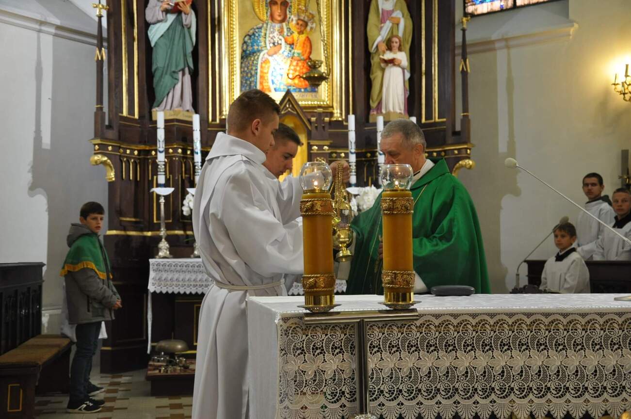 6 listopada na Mszy św. o godz. 10.15 modliliśmy się w intencji księdza wikariusza, który 5 listopada obchodził swoje imieniny, a dzień wcześniej urodziny. Poprzedzając Liturgię przedstawiciele grup parafialnych złożyli najserdeczniejsze życzenia, życząc wiele zdrowia, anielskiej cierpliwości i niegasnącego uśmiechu przeszywającego serce, które zawsze jest gotowe nieść pomoc każdemu. Parafianie zapewnili o swojej modlitwie i prosili Matkę Bożą o opiekę nad księdzem. Po wspólnej Eucharystii było wystawienie Najświętszego Sakramentu i Modlitwa Różańcowa. Wychodząc z kościoła można było się poczęstować cukierkami imieninowymi u ministrantów.