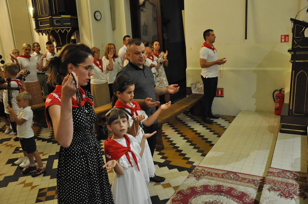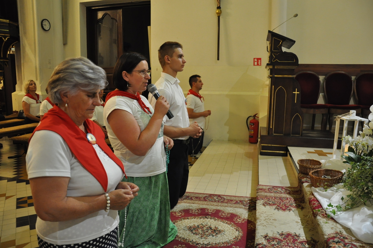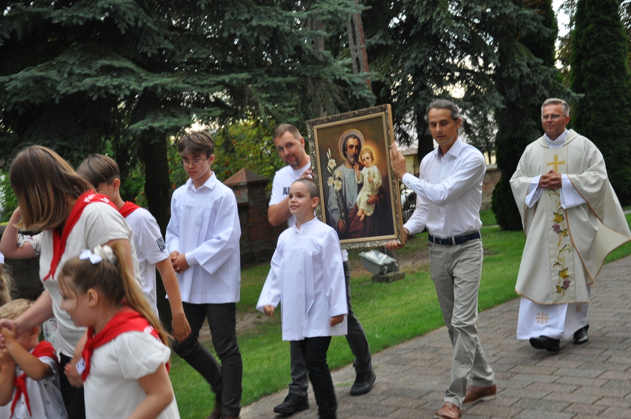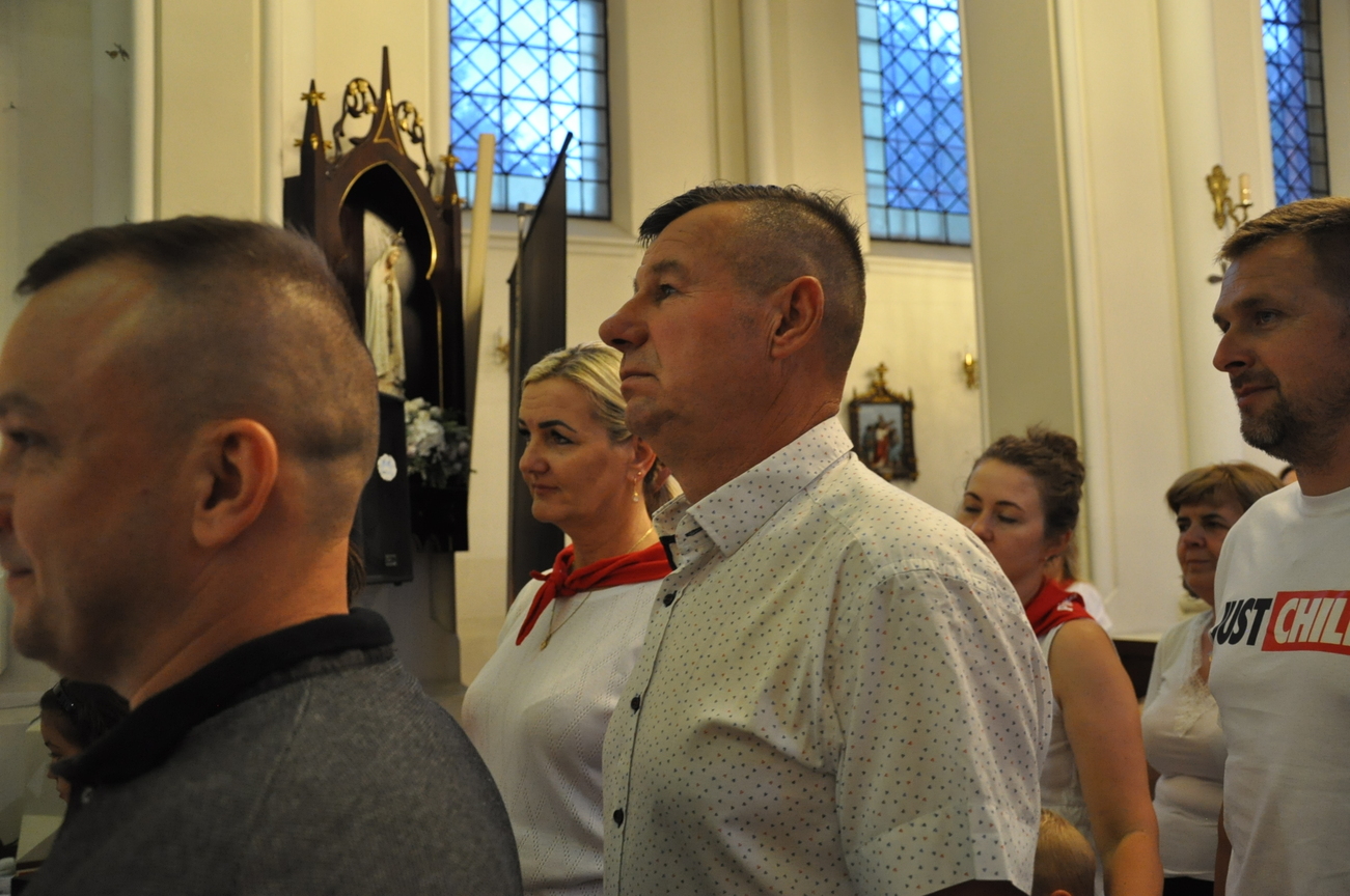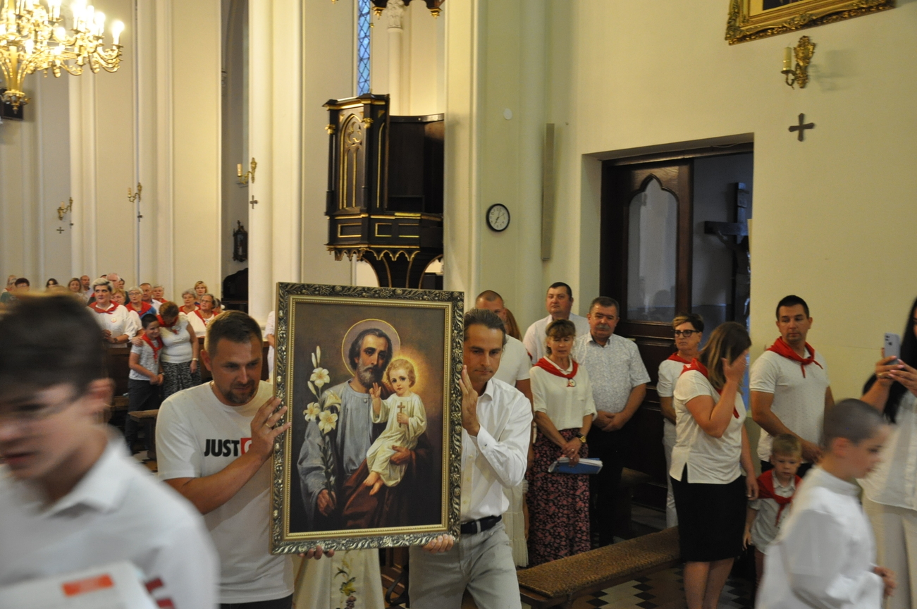 Czwarty dzień pielgrzymki przebiegał pod hasłem RODZINA. Szczególnym patronem  dnia dzisiejszego był Św. Józef, którego wizerunek w uroczystej procesji do ołtarza  przynieśli przedstawiciele mężów i ojców naszej rodziny parafialnej. Małżonkowie przed Bogiem i w obecności swoich dzieci odnowili przysięgę małżeńską i jak to było w dniu ślubu, razem podeszli aby przyjąć Pana Jezusa do swego serca i życia rodzinnego. A rozważając tajemnice Różańca Świętego dziękowali za otrzymane łaski i prosili o błogosławieństwo na dalsze lata.