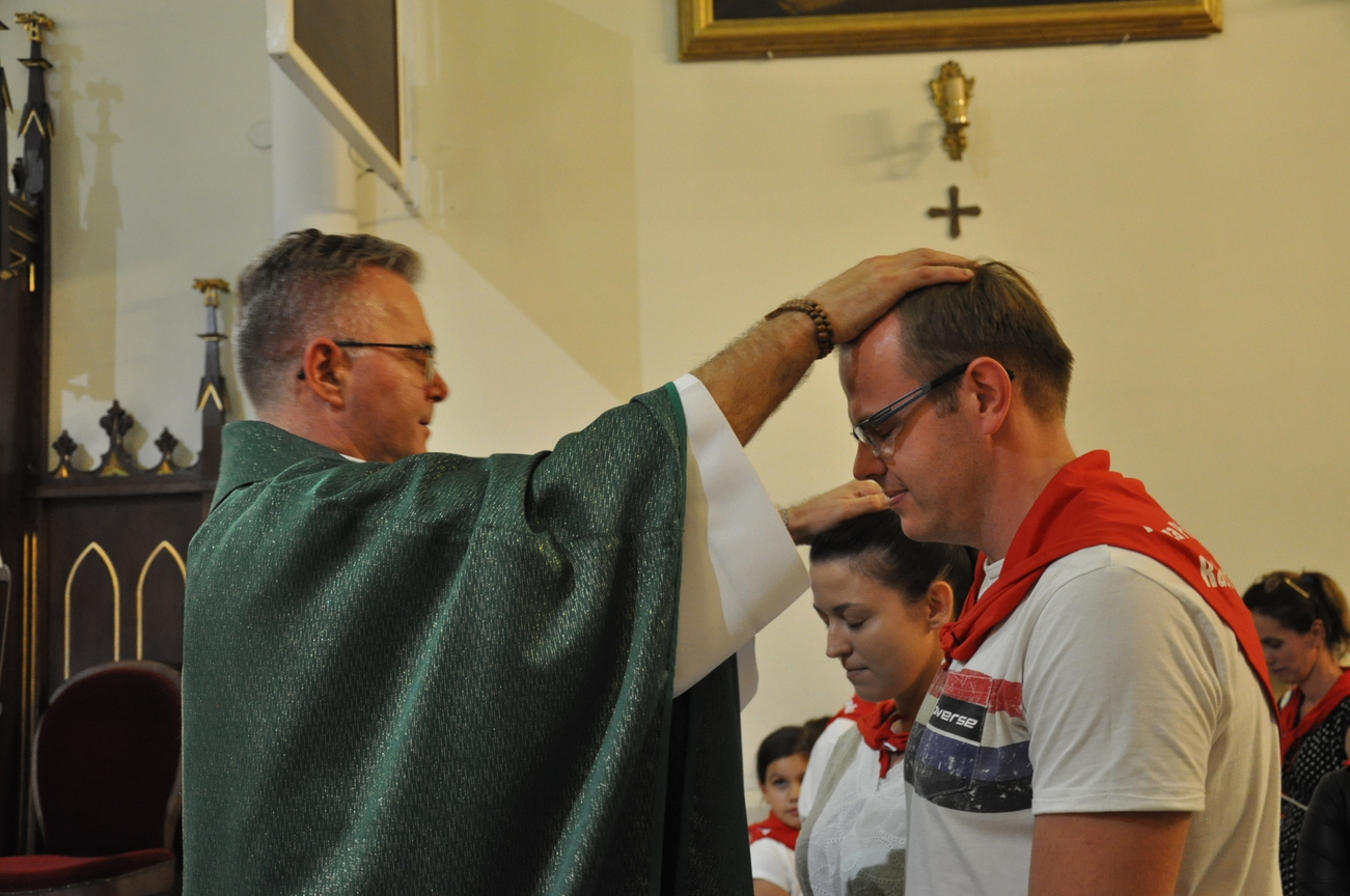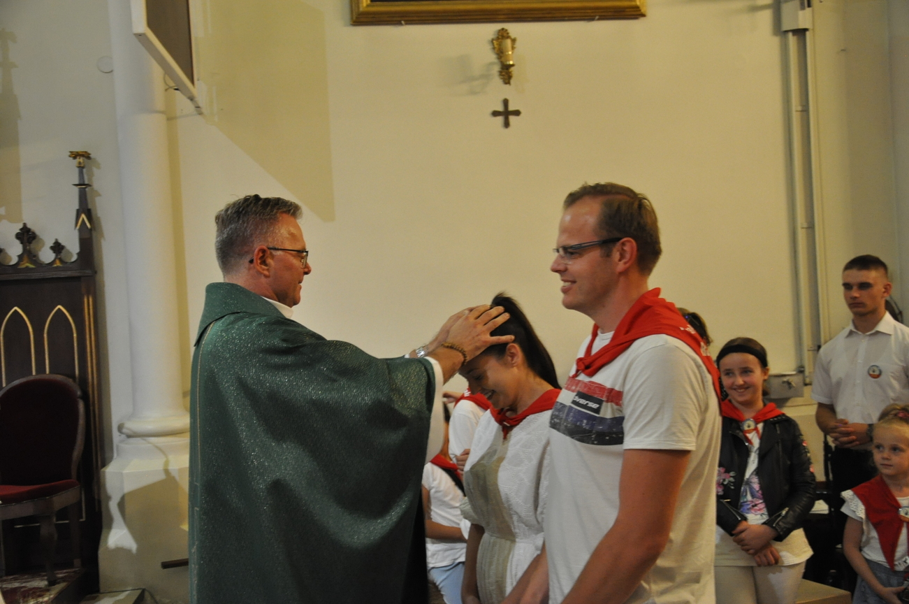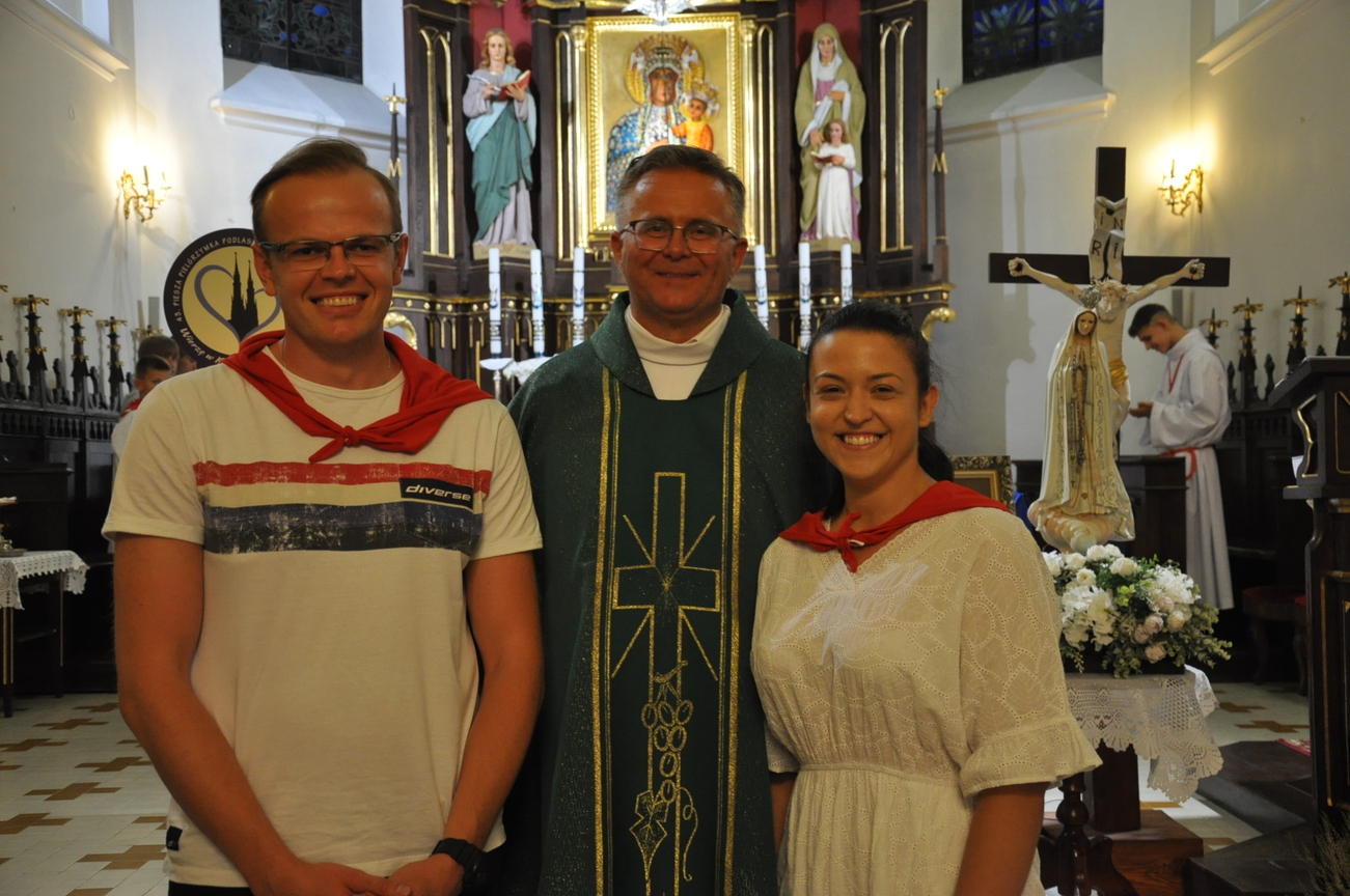 To już 12 dzień Duchowego Pielgrzymowania. Według planu trasy Pieszej Pielgrzymki dzisiaj dotarliśmy do Mirowa, a tam tradycją są śluby pielgrzymkowe. W naszej wspólnocie parafialnej podobna tradycja miała miejsce. Co prawda nie ślub, a 1 rocznica ślubu. Podczas Mszy św. modliliśmy się w intencji państwa Mileny i Sebastiana. Ks. Sławomir udzielił małżonkom uroczystego błogosławieństwa. Oczywiście nie zabrakło też wyśpiewanych życzeń od wszystkich parafian i braw.