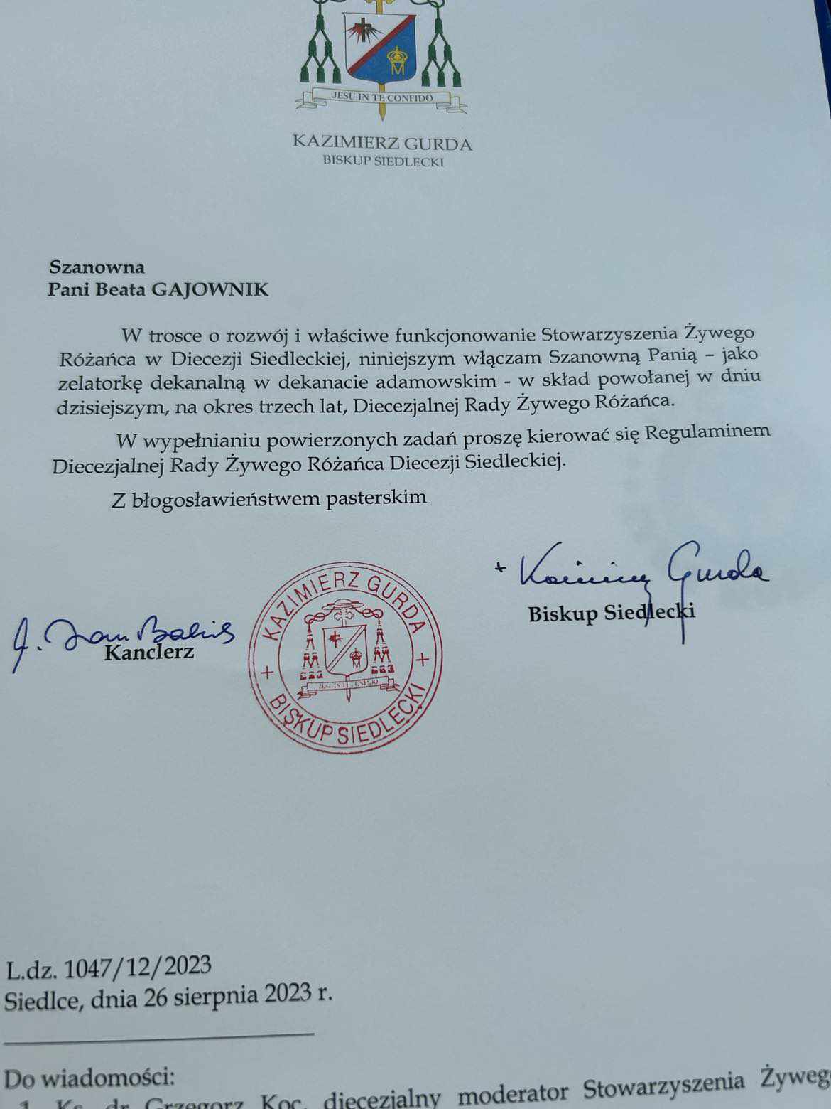 Bardzo miłym akcentem był moment powołania nowych zelatorów dekanalnych. Dla naszej parafii było to szczególnie miłe, ponieważ P. BEATA GAJOWNIK odebrała z rąk ks. Biskupa Grzegorza nominację na zelatorkę dekanatu adamowskiego, a tym samym powołana do Diecezjalnej Rady Żywego Różańca. GRATULUJEMY!