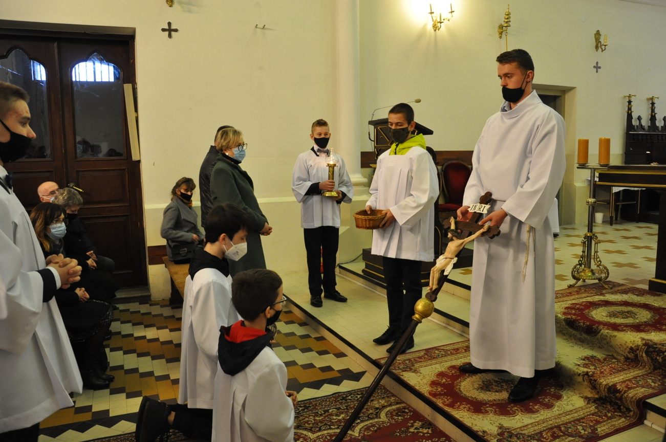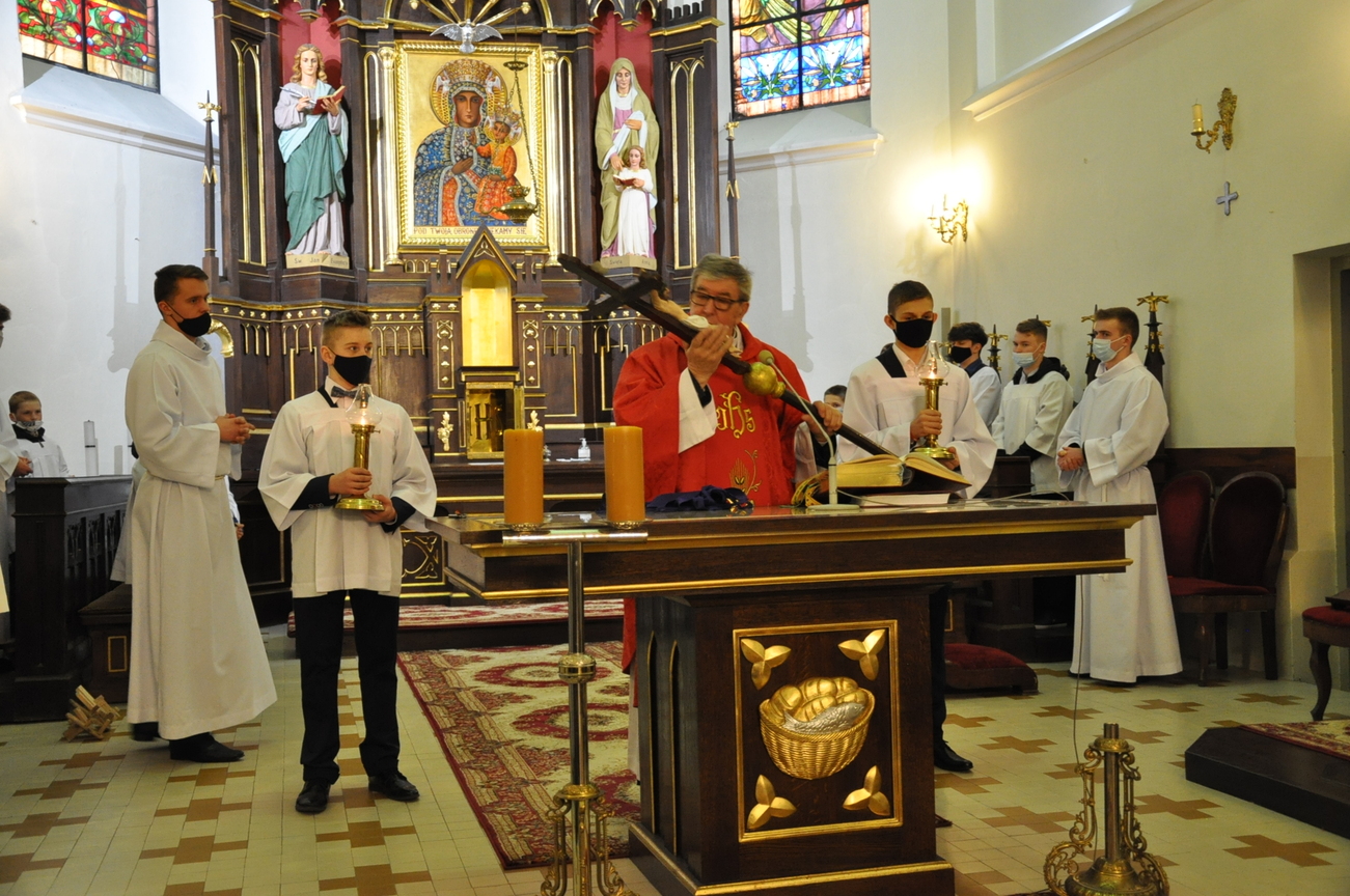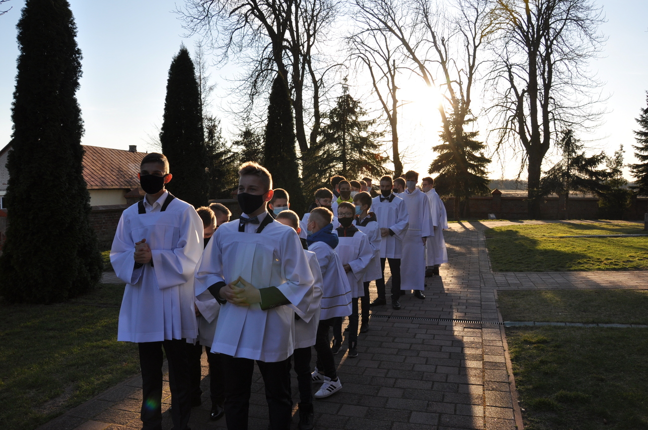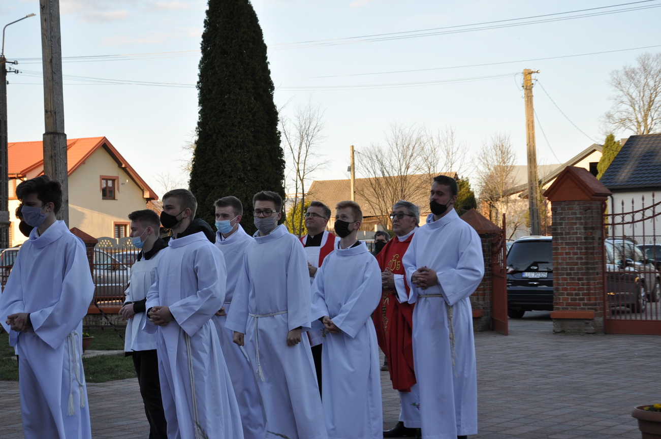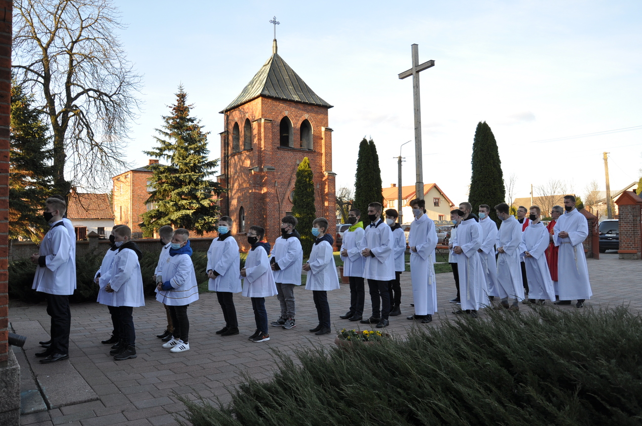 Wielki Piątek to dzień Krzyża, pamiątka śmierci Pana Jezusa. Krzyż jest w centrum liturgii. Przez cały dzień nie sprawuje się Mszy Świętej. Komunii udziela się tylko w czasie Liturgii Męki Pańskiej. Zakazuje się sprawowania Sakramentów, poza Namaszczeniem Chorych i Spowiedzią. Na początku celebrans z asystą zbliża się do Ołtarza. Procesja wejścia odbywa się w milczeniu, bez śpiewu. Kapłan oddaje cześć Chrystusowi Zbawicielowi – leżąc krzyżem. Wierni w tym czasie, klęcząc, w milczeniu uwielbiają Pana za Jego miłość i przepraszają za swoje grzechy. Następnie odczytuje się opis Męki Pańskiej z Ewangelii Świętego Jana. Potem uroczyście odsłania się Krzyż. W czasie tej czynności kapłan trzykrotnie śpiewa: „Oto drzewo krzyża, na którym zawisło Zbawienie świata”, na co ludzie odpowiadają: „Pójdźmy z pokłonem.” Następnie wszyscy wierni mogą podejść i ucałować odsłonięty Krzyż – w tym roku ze względu epidemii w naszym imieniu uczynił to ks. Proboszcz. Potem uczestnicy Liturgii mogą przyjąć Komunię.  Na zakończenie Nabożeństwa przenosi się Najświętszy Sakrament do bocznego ołtarza – Grobu Pańskiego, w monstrancji okrytej przezroczystym welonem. Procesja odbywa się przy śpiewie: „Odszedł Pasterz nasz, co ukochał lud”. Po liturgii znowu odkrywa się ołtarz. Adoracja Najświętszego Sakramentu w Grobie Pańskim trwa do późnych godzin wieczornych.