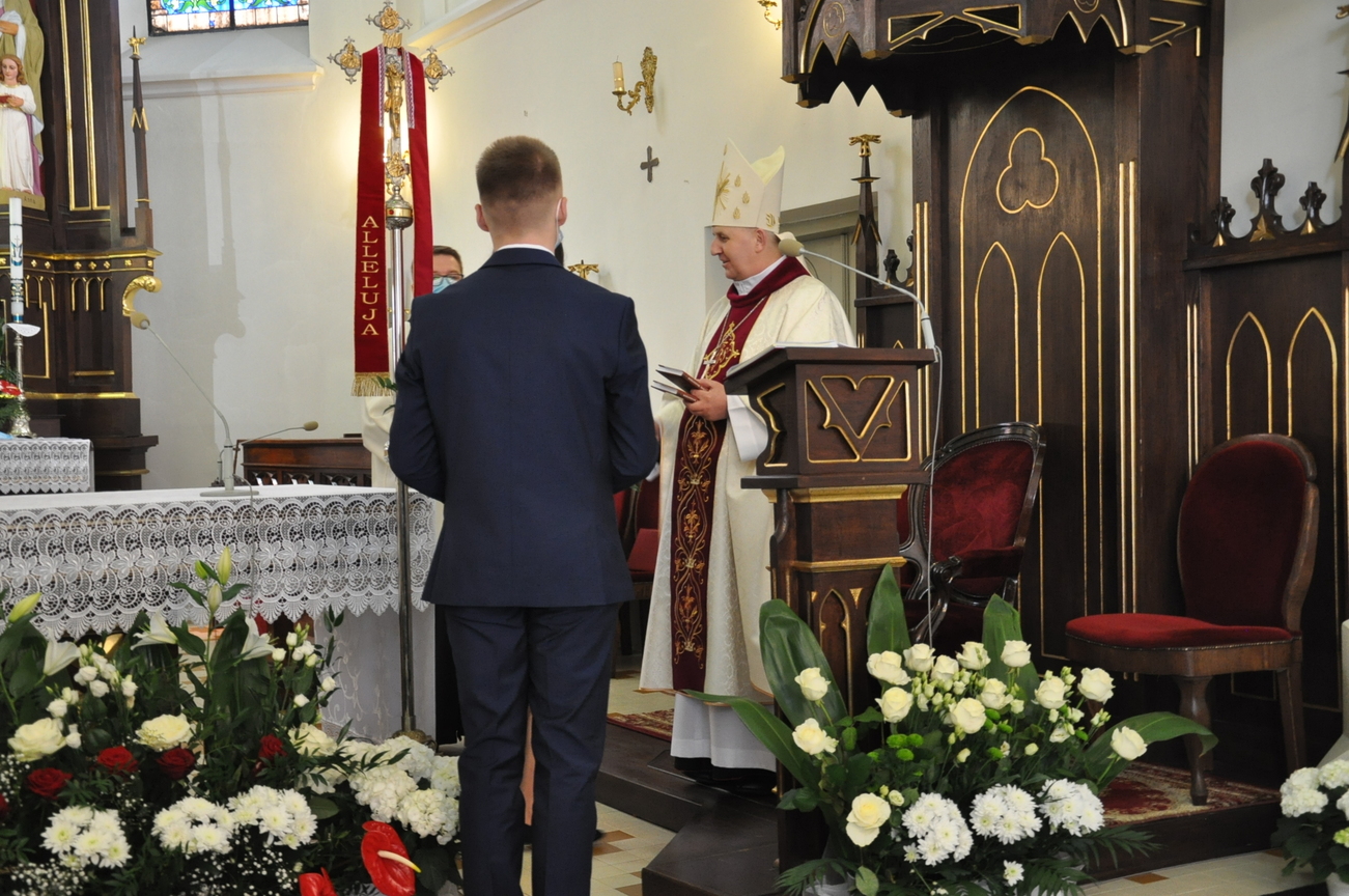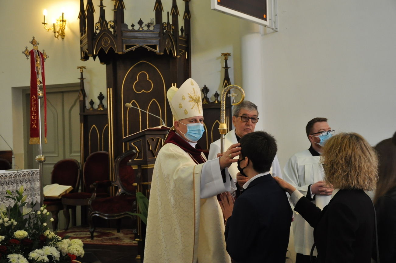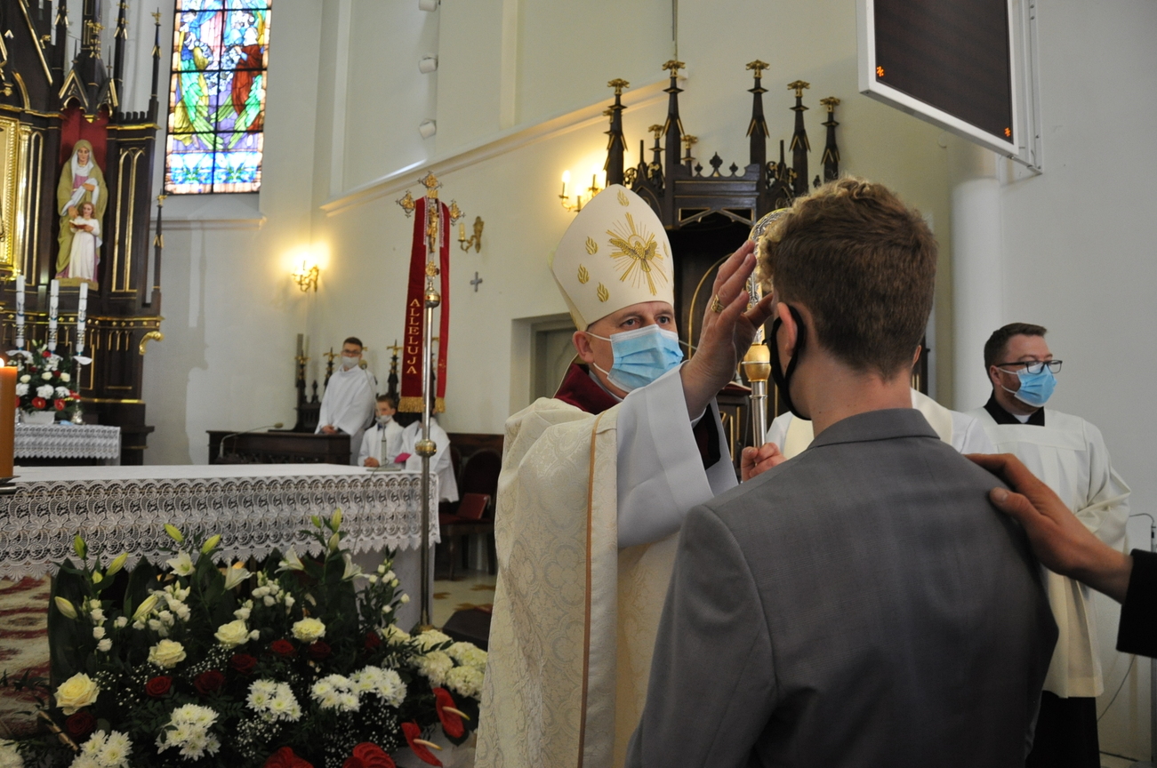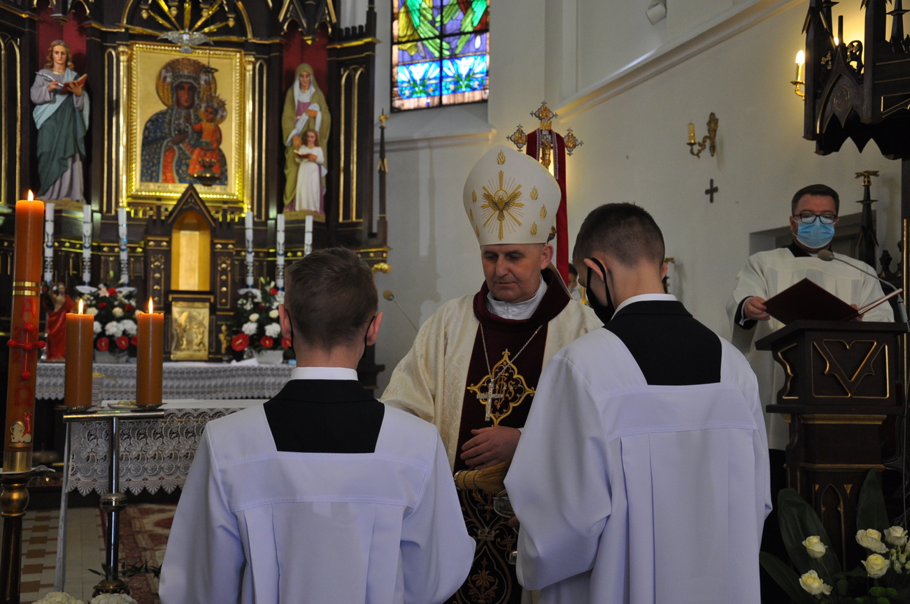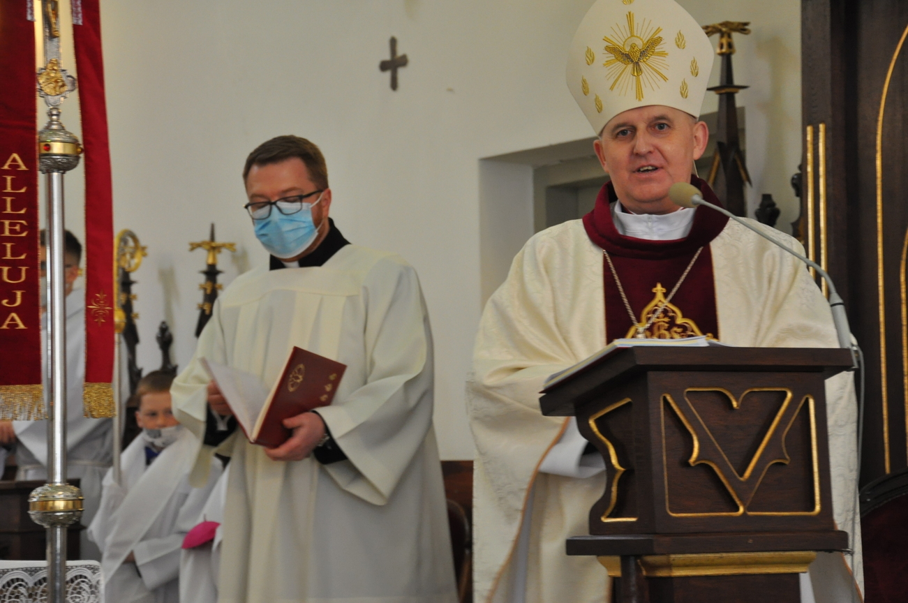 18 kwietnia na Mszy św. o godz. 12.00 Ksiądz Biskup Grzegorz Suchodolski udzielił naszej młodzieży sakramentu bierzmowania. W trakcie Eucharystii podczas procesji z darami, młodzi przynieśli jako swój dar dla Kościoła dwa nowo zakupione czerwone ornaty i ofiary na Misję.  Niech Duch Święty, którego otrzymali umocni ich do mężnego wyznawania wiary. A pamiątkowe dla nich, krzyże które na zakończenie Eucharystii zostały poświęcone  i rozdane niech im pomagają w trwaniu przy Chrystusie.