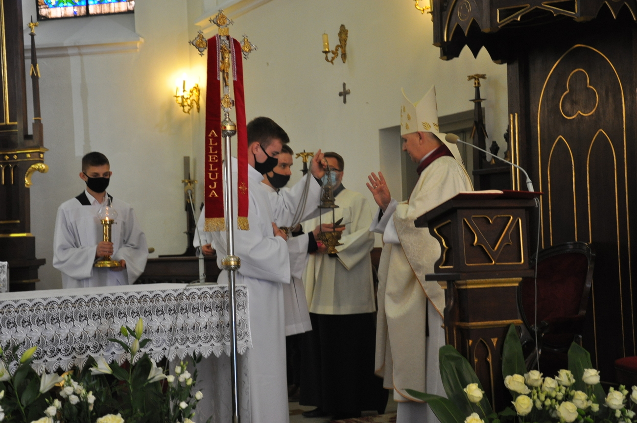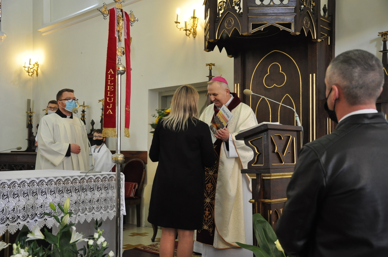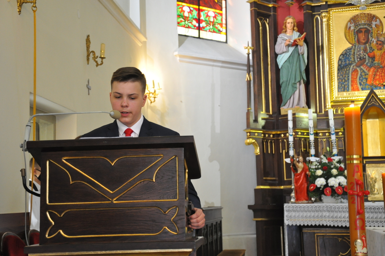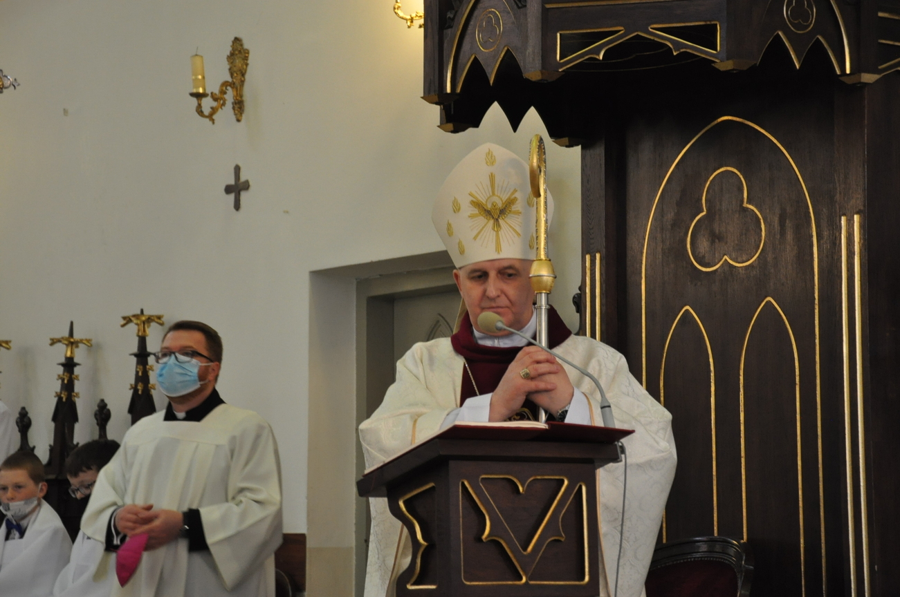 18 kwietnia na Mszy św. o godz. 12.00 Ksiądz Biskup Grzegorz Suchodolski udzielił naszej młodzieży sakramentu bierzmowania. W trakcie Eucharystii podczas procesji z darami, młodzi przynieśli jako swój dar dla Kościoła dwa nowo zakupione czerwone ornaty i ofiary na Misję.  Niech Duch Święty, którego otrzymali umocni ich do mężnego wyznawania wiary. A pamiątkowe dla nich, krzyże które na zakończenie Eucharystii zostały poświęcone  i rozdane niech im pomagają w trwaniu przy Chrystusie.