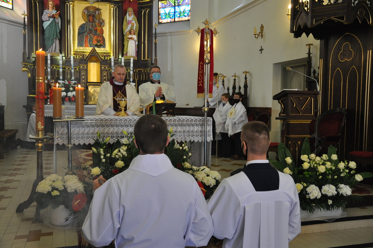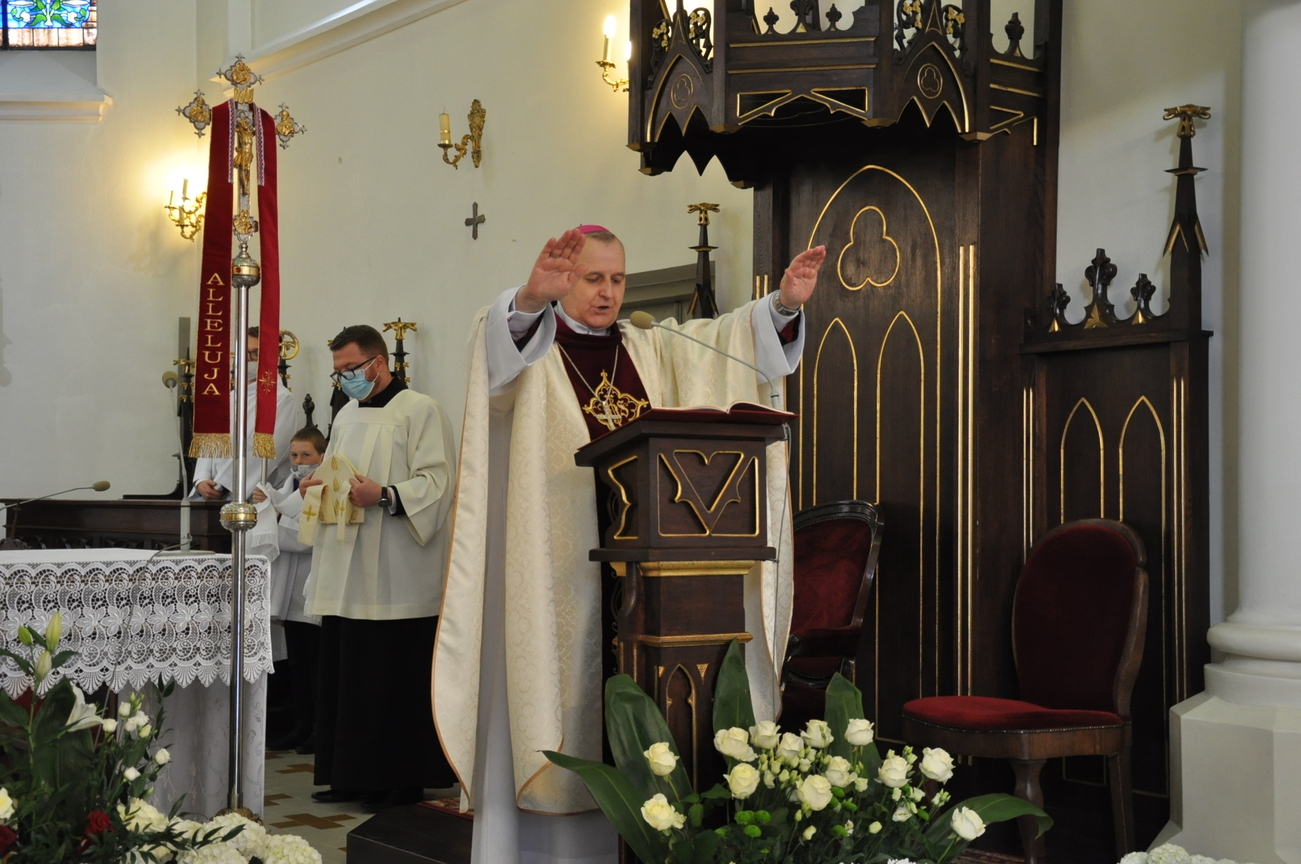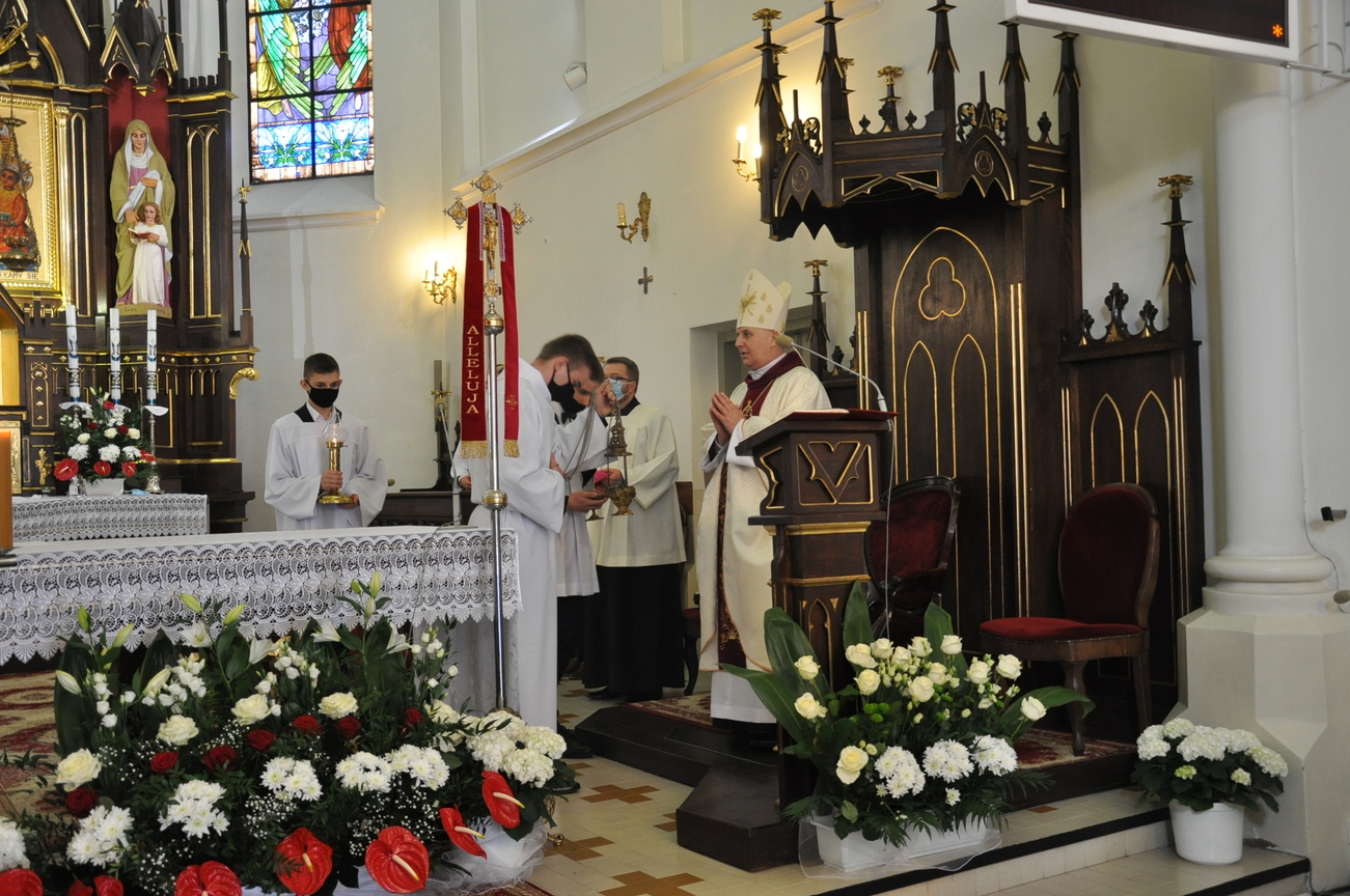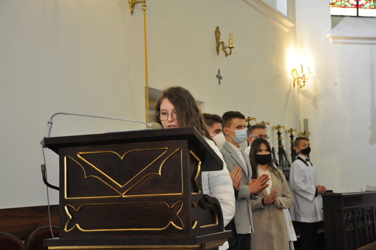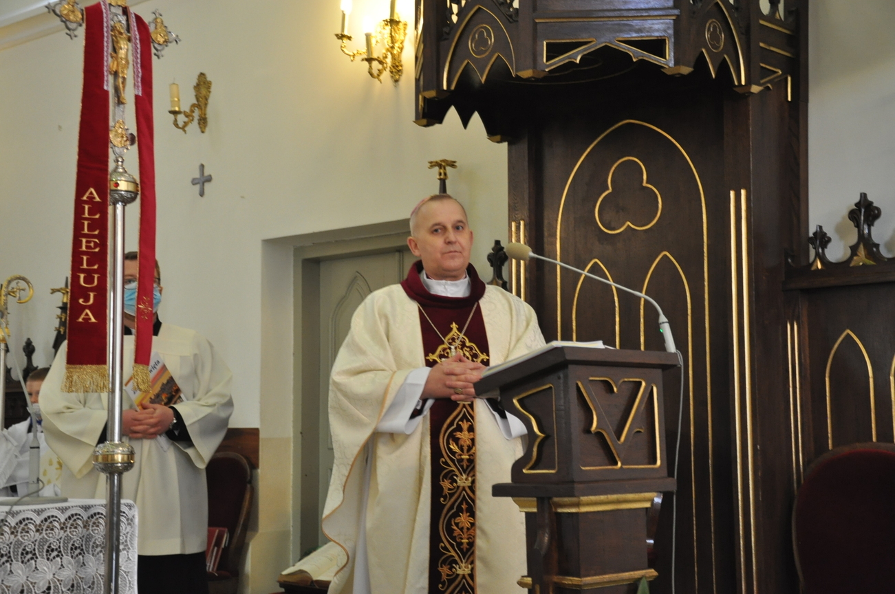 18 kwietnia na Mszy św. o godz. 12.00 Ksiądz Biskup Grzegorz Suchodolski udzielił naszej młodzieży sakramentu bierzmowania. W trakcie Eucharystii podczas procesji z darami, młodzi przynieśli jako swój dar dla Kościoła dwa nowo zakupione czerwone ornaty i ofiary na Misję.  Niech Duch Święty, którego otrzymali umocni ich do mężnego wyznawania wiary. A pamiątkowe dla nich, krzyże które na zakończenie Eucharystii zostały poświęcone  i rozdane niech im pomagają w trwaniu przy Chrystusie.
