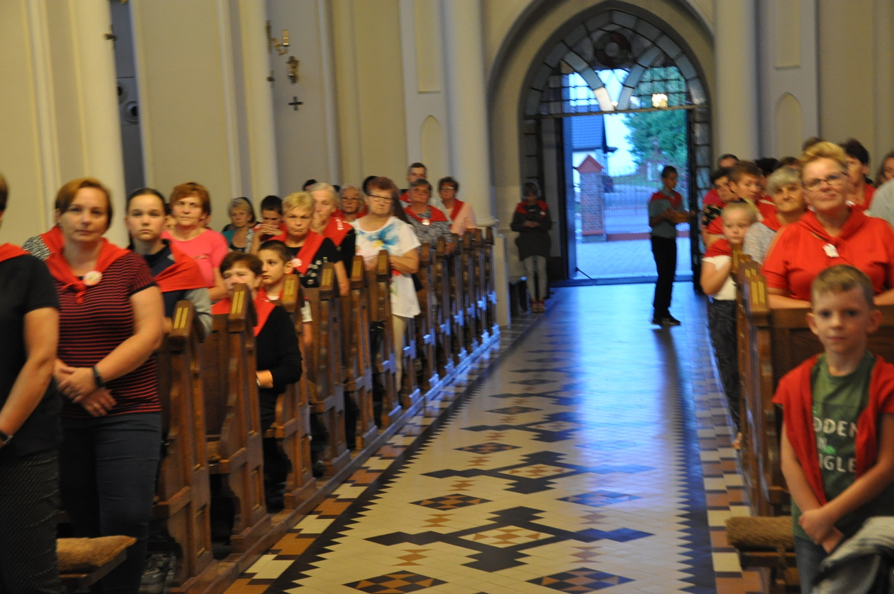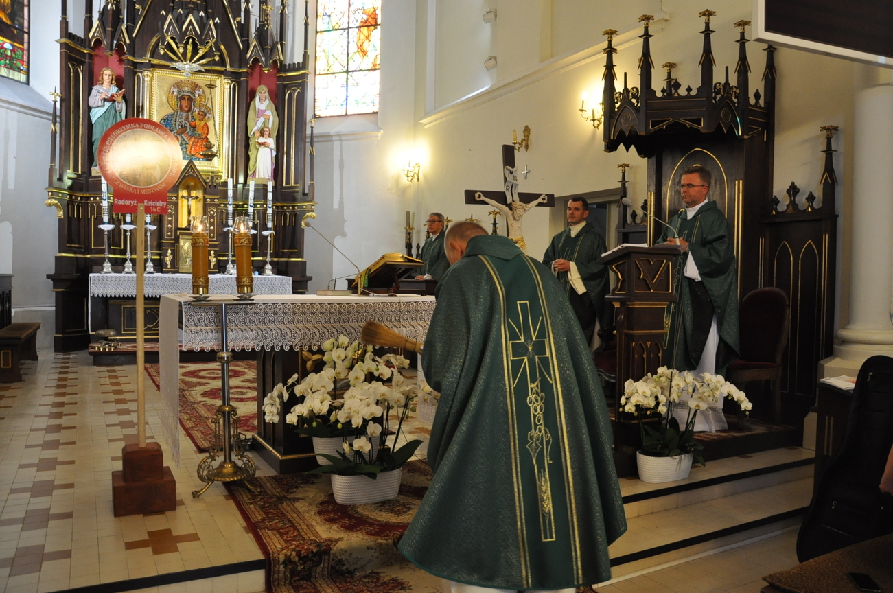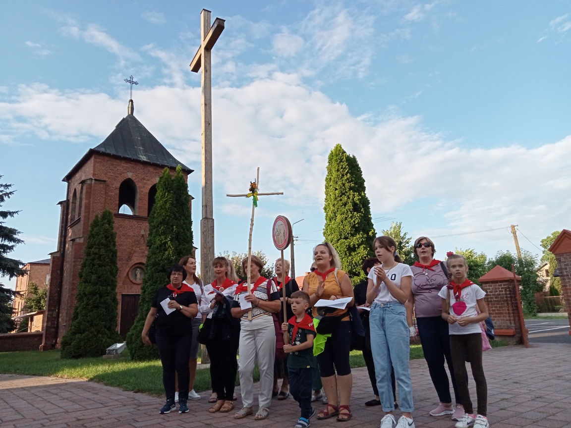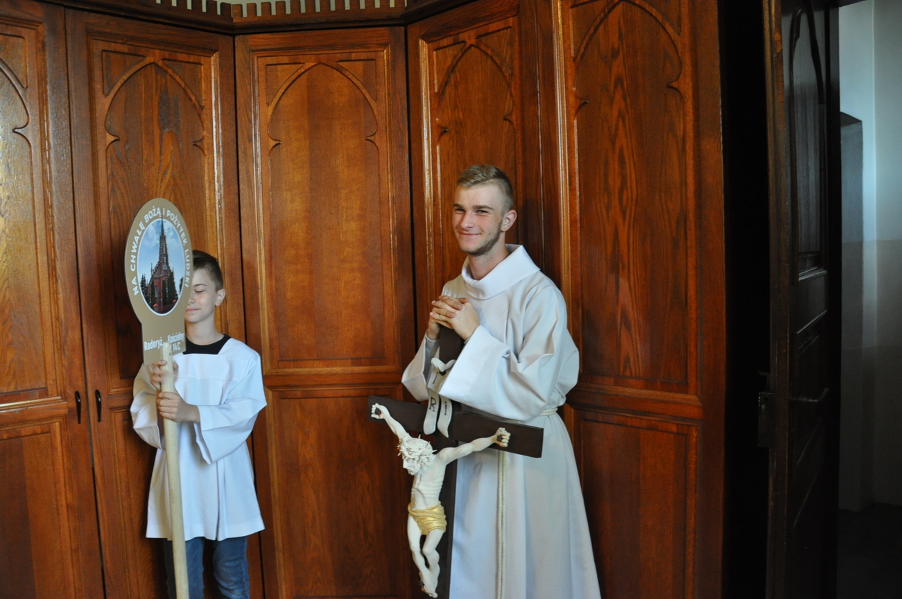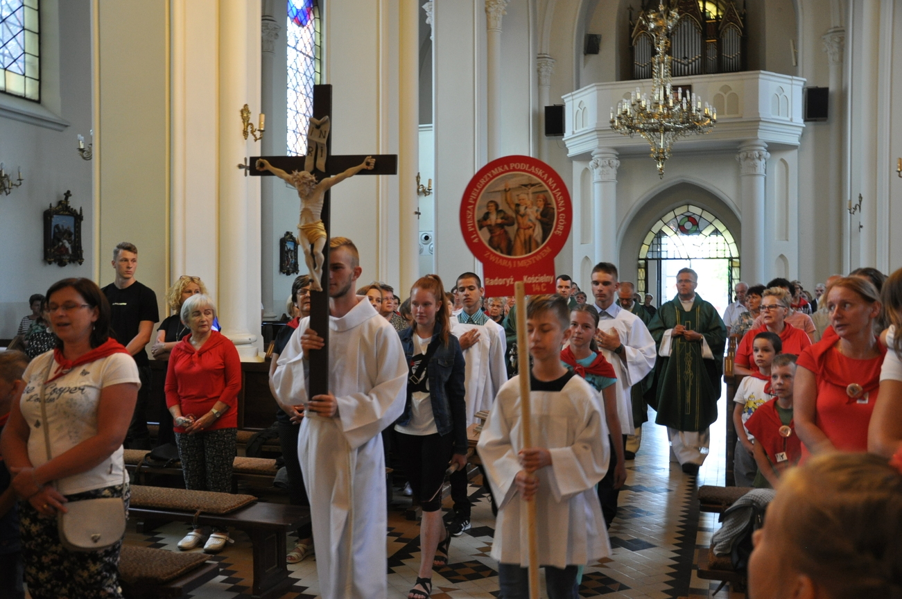 Dzień dzisiejszy naznaczony był wieloma symbolami. W uroczystym, procesyjnym wejściu został przyniesiony przed ołtarz znaczek tegorocznej pielgrzymki, oraz kopia Krzyża Pratulińskiego, którego poświęcenia dokonał ksiądz proboszcz Zbigniew Daniluk.