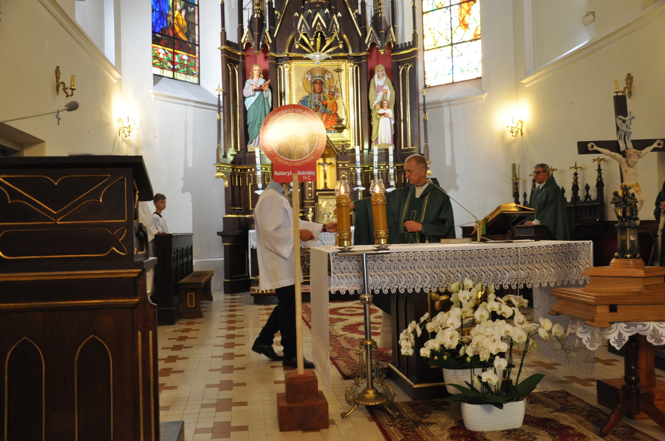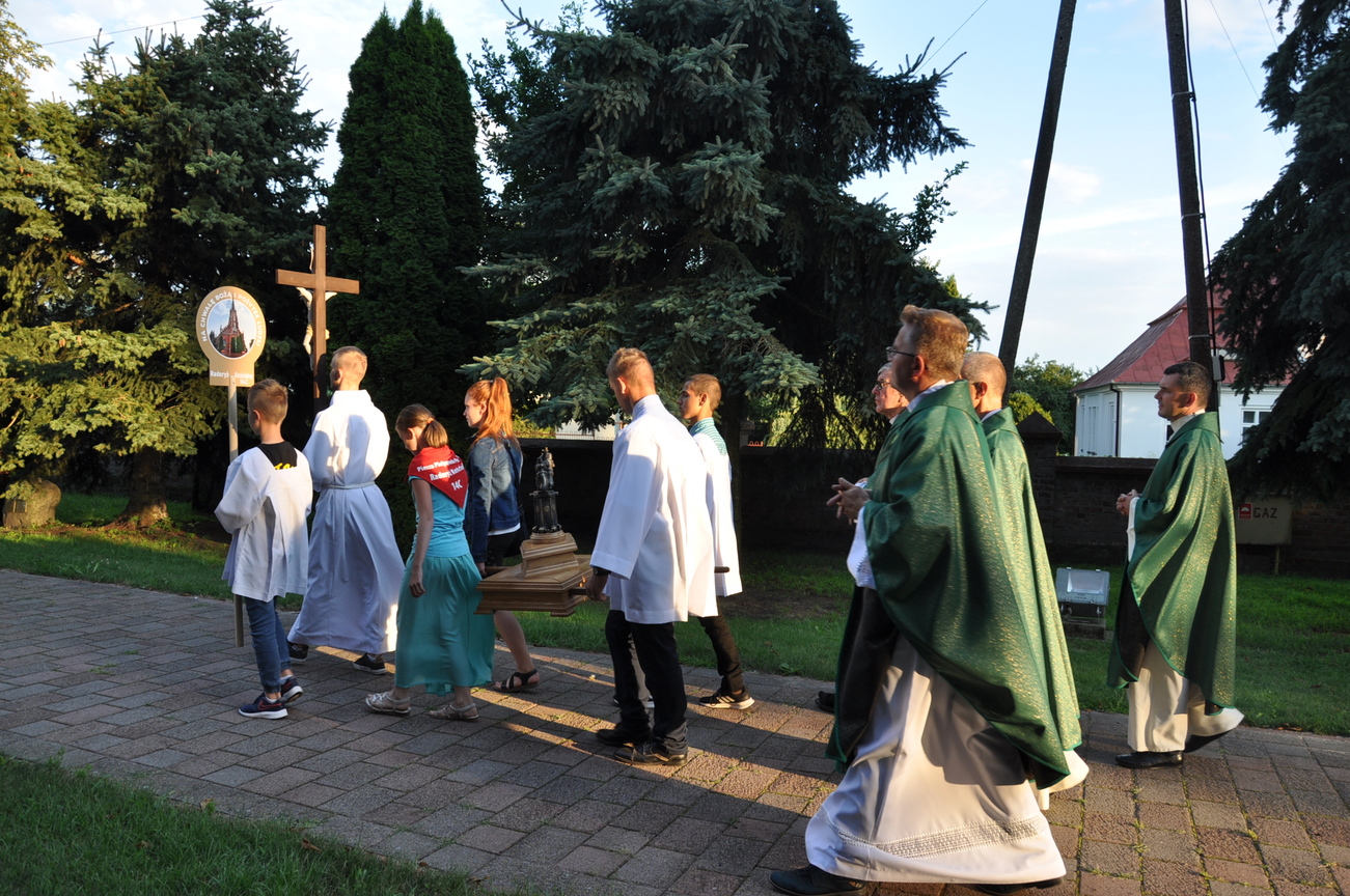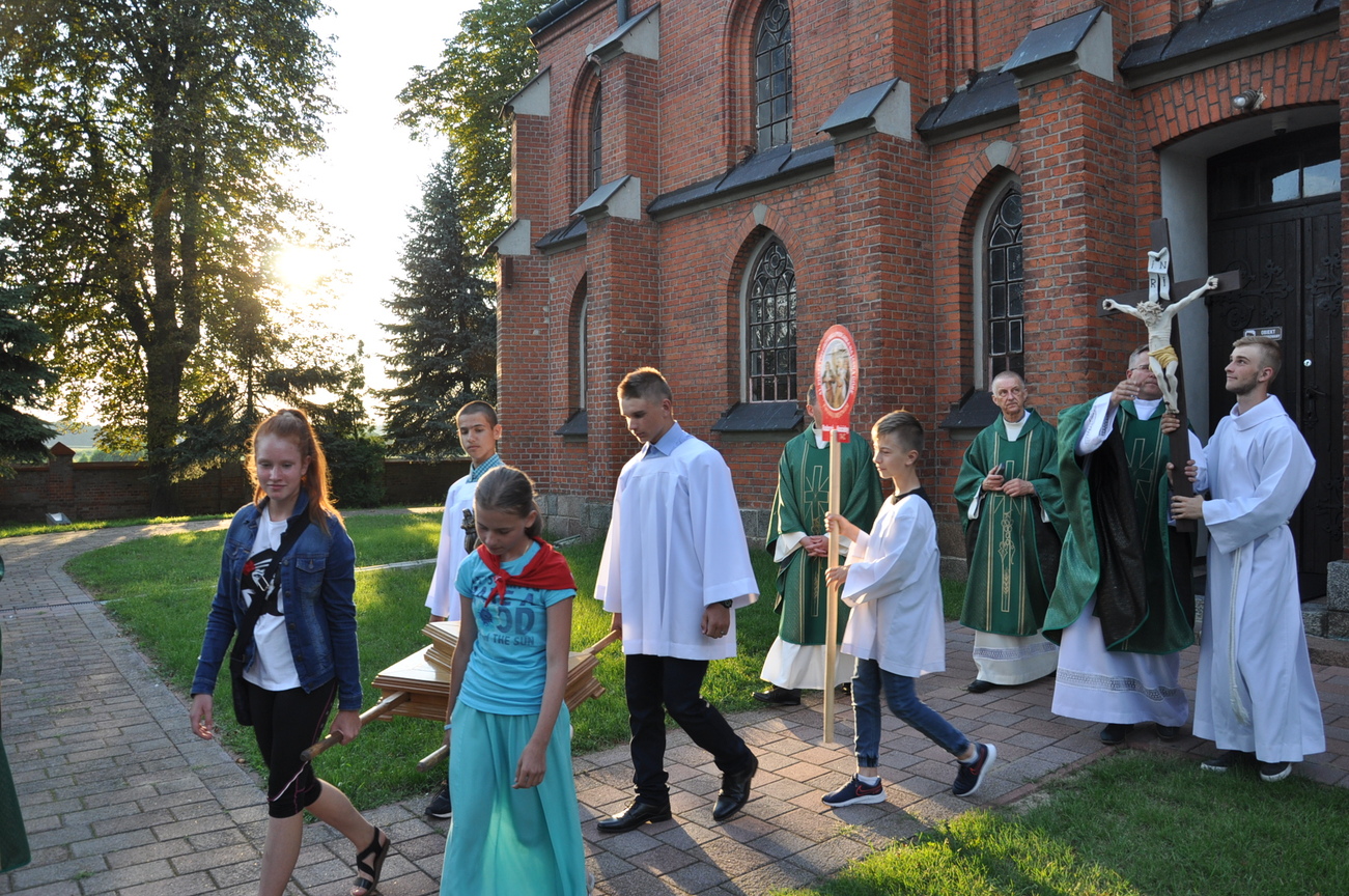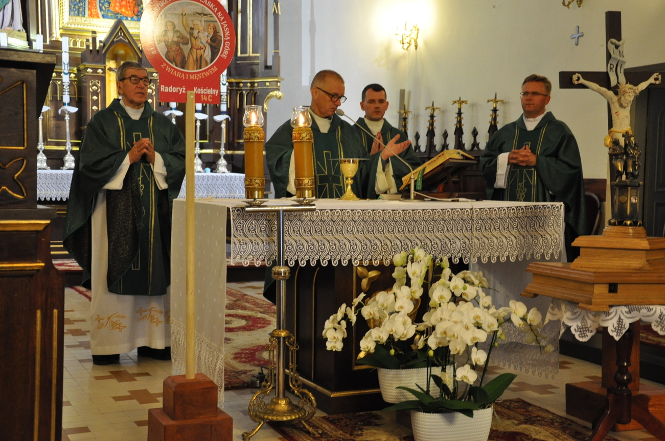 Dzień dzisiejszy naznaczony był wieloma symbolami. W uroczystym, procesyjnym wejściu został przyniesiony przed ołtarz znaczek tegorocznej pielgrzymki, oraz kopia Krzyża Pratulińskiego, którego poświęcenia dokonał ksiądz proboszcz Zbigniew Daniluk.