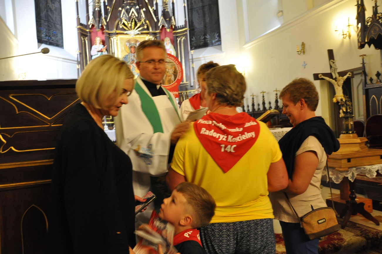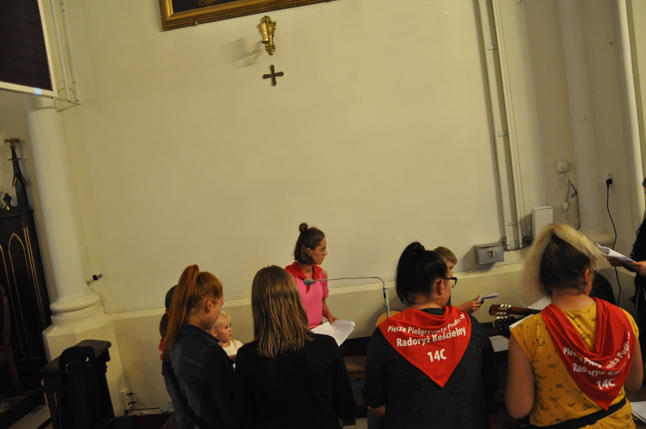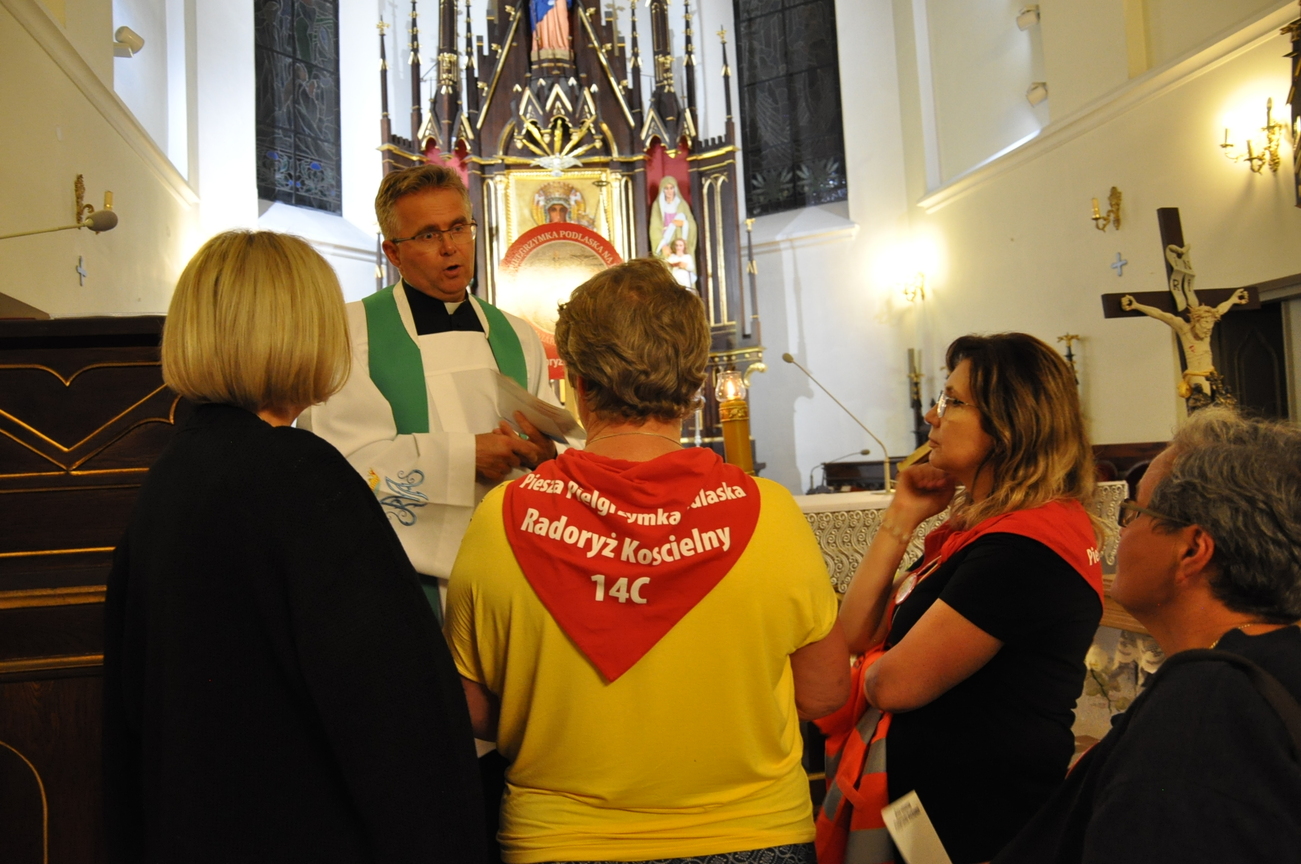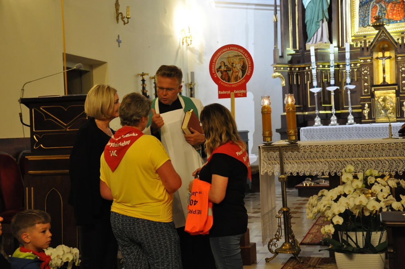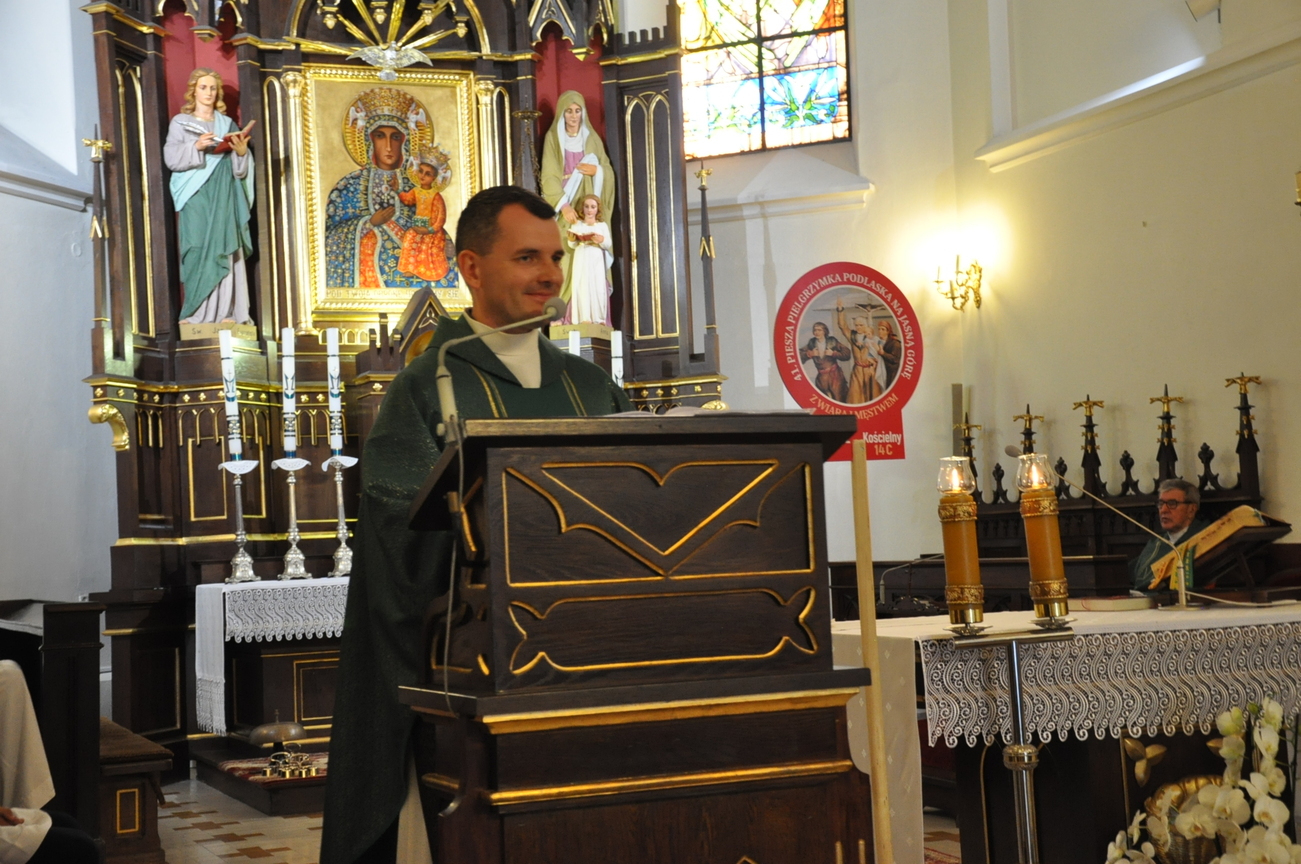 Ksiądz Sławomir zadbał aby pierwszy dzień naszej pielgrzymki uświetniony był obecnością wyjątkowego gościa. Sam kierownik Pieszej Pielgrzymki Podlaskiej na Jasną Górę ks. Paweł Bielecki skierował do nas słowo podczas Mszy Świętej. Wyjaśnił nam że pielgrzymowanie to Łaska, której udziela nam Pan Bóg, że pielgrzymowanie to nie tylko wysiłek fizyczny, ale to przemiana duchowa i pragnienie bycia bliżej Boga. Odpowiadając na prośbę ks. Biskupa Kazimierza Gurdy w czasie Mszy Św. modliliśmy się min. za kapłanów , oraz o nowe powołania kapłańskie i zakonne. Po zakończonej Eucharystii przedstawiciele wspólnoty Domowego Kościoła poprowadzili modlitwę różańcową, rozważając tajemnice bolesne w duchu pielgrzymkowym.