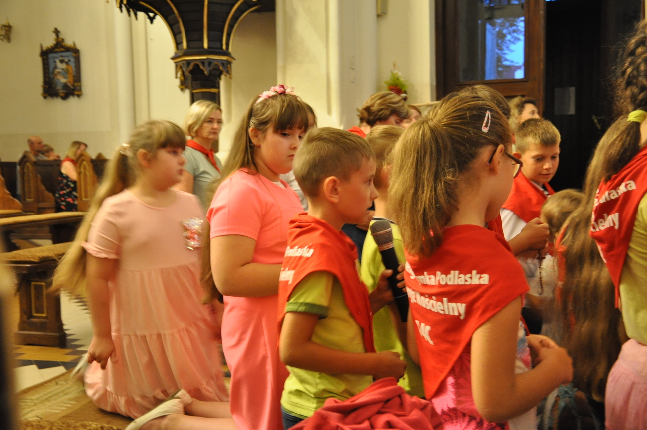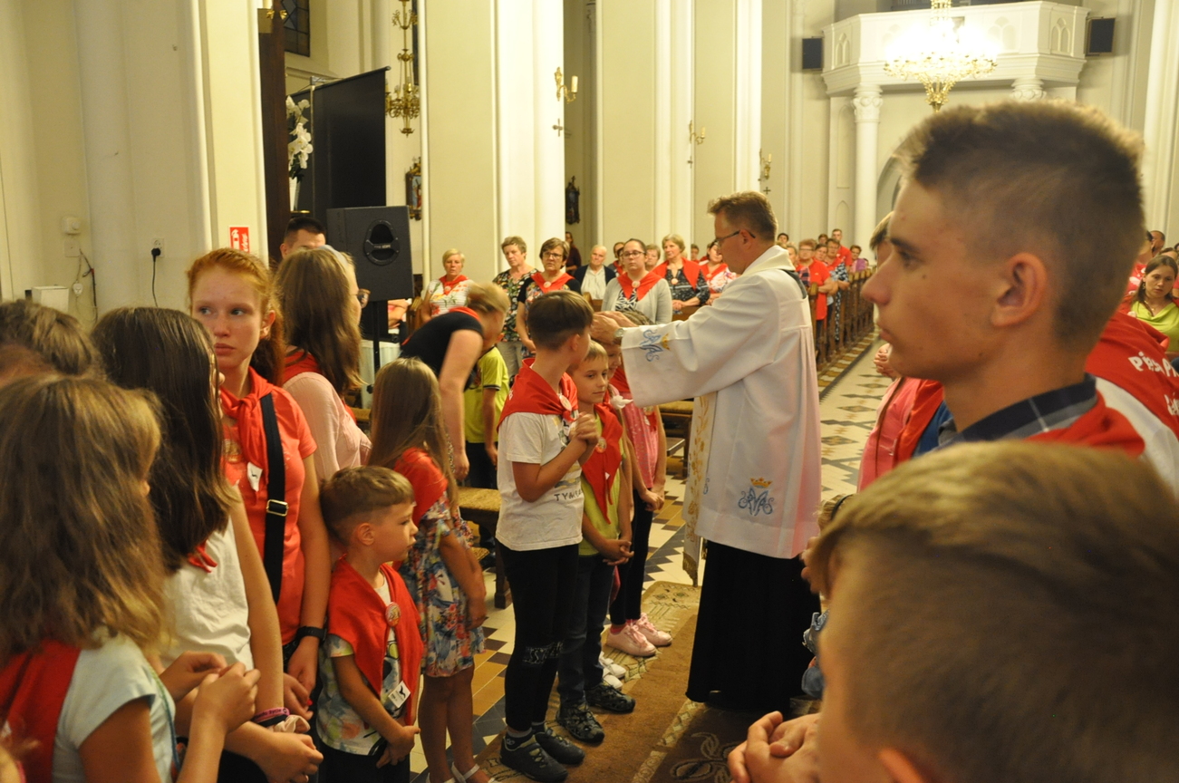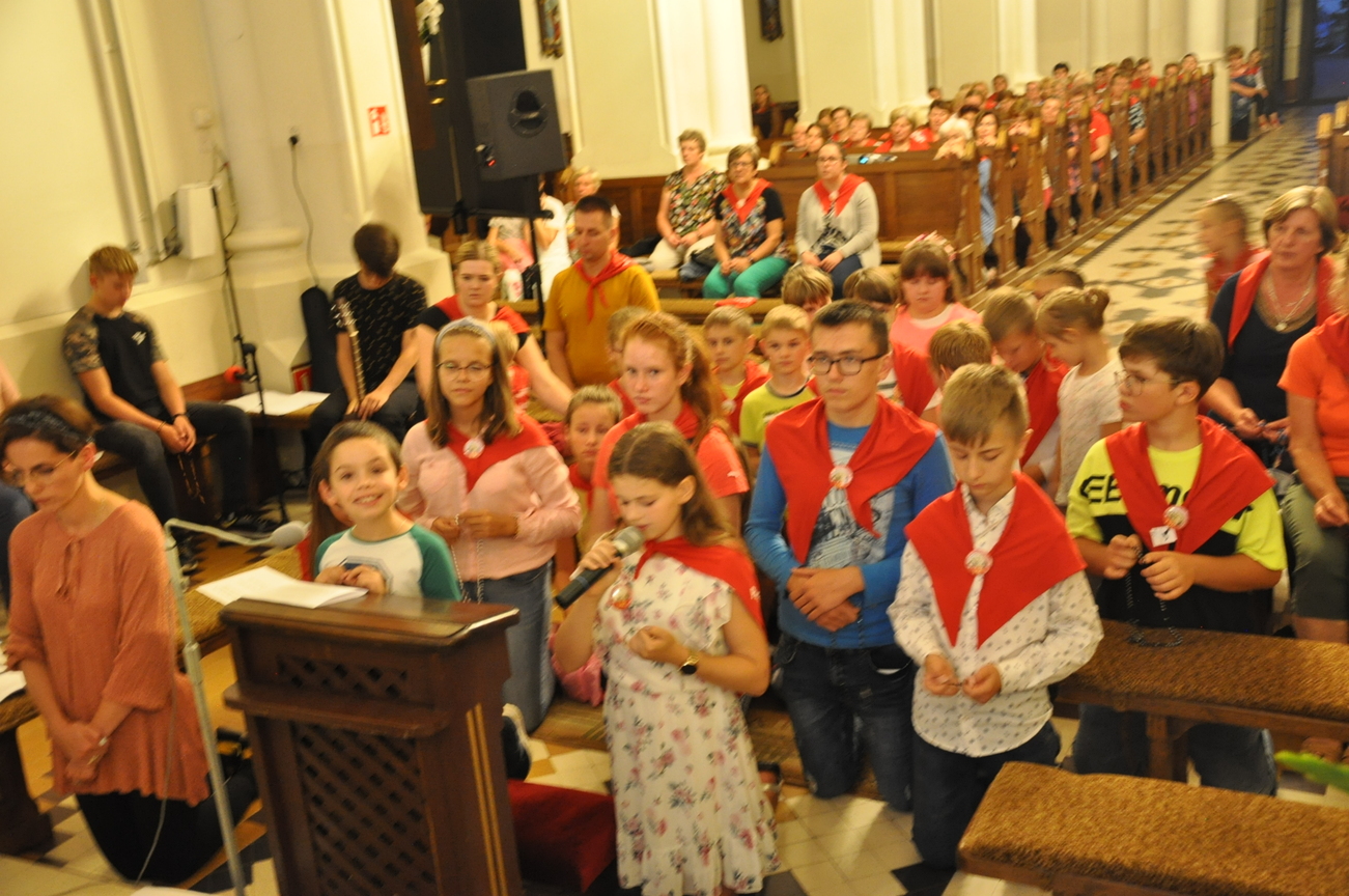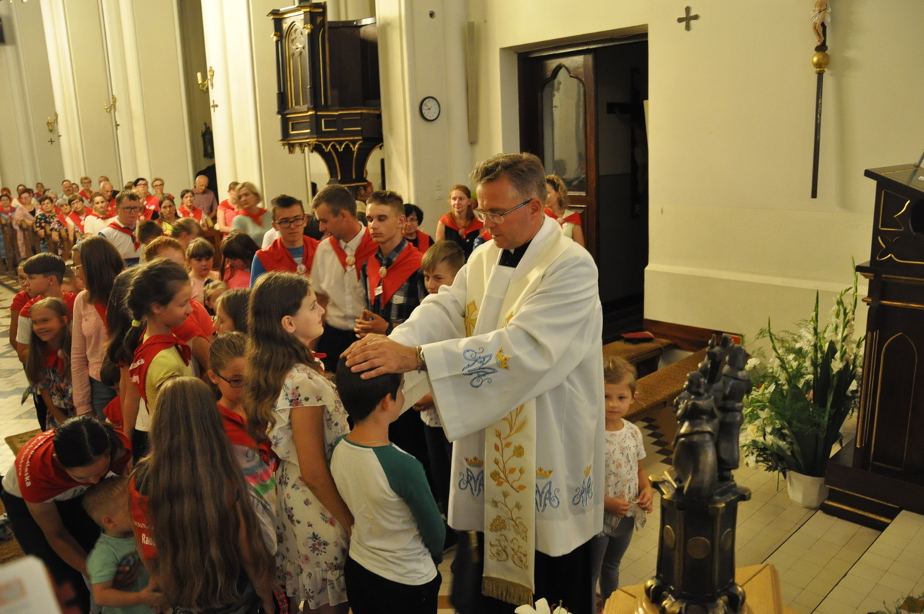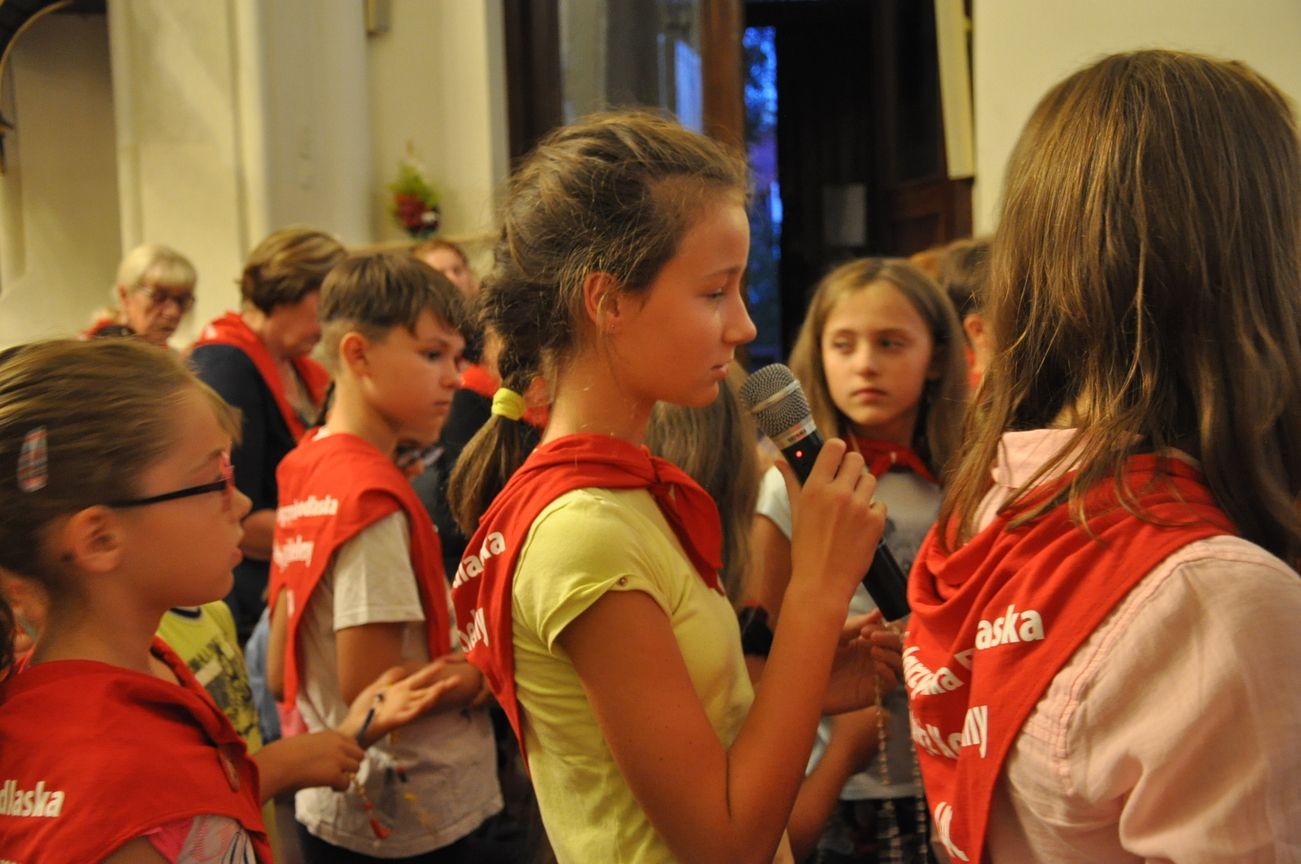 Anielskie głosy naszych najmłodszych pątników rozbrzmiewały w świątyni podczas rozważania radosnych tajemnic Różańca Świętego. Następnie ks. Sławomir udzielił dzieciom uroczystego błogosławieństwa z nałożeniem rąk.