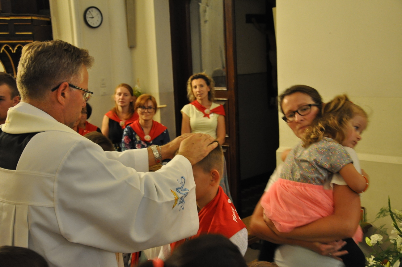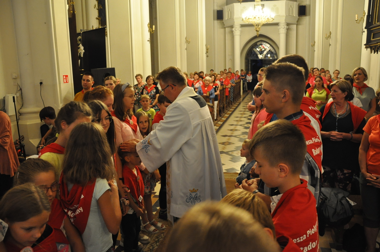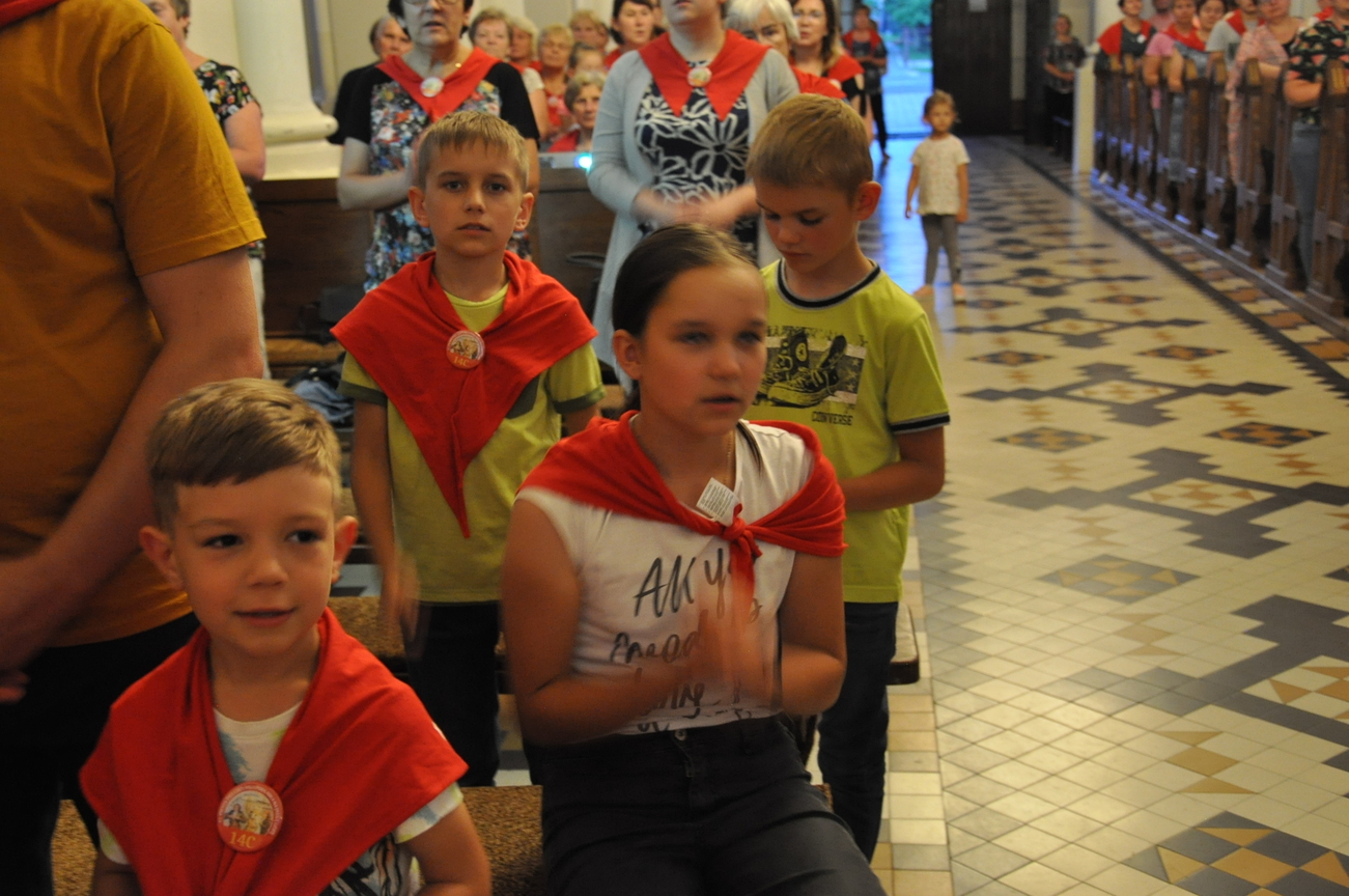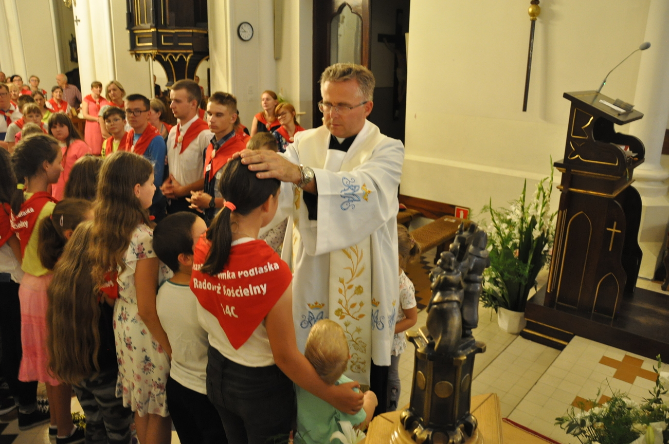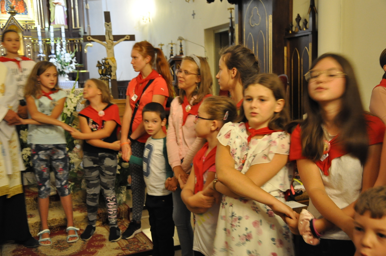 Anielskie głosy naszych najmłodszych pątników rozbrzmiewały w świątyni podczas rozważania radosnych tajemnic Różańca Świętego. Następnie ks. Sławomir udzielił dzieciom uroczystego błogosławieństwa z nałożeniem rąk.