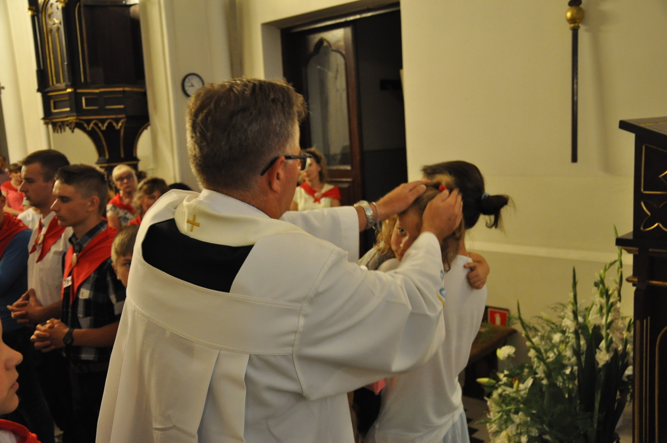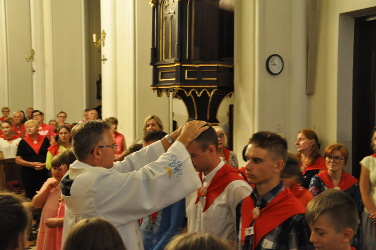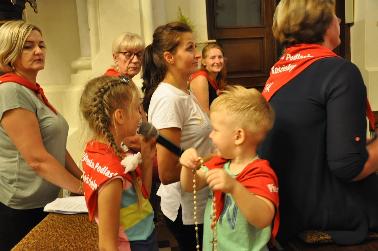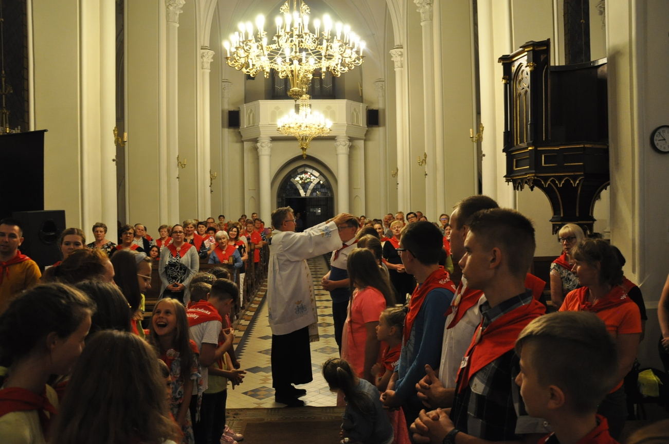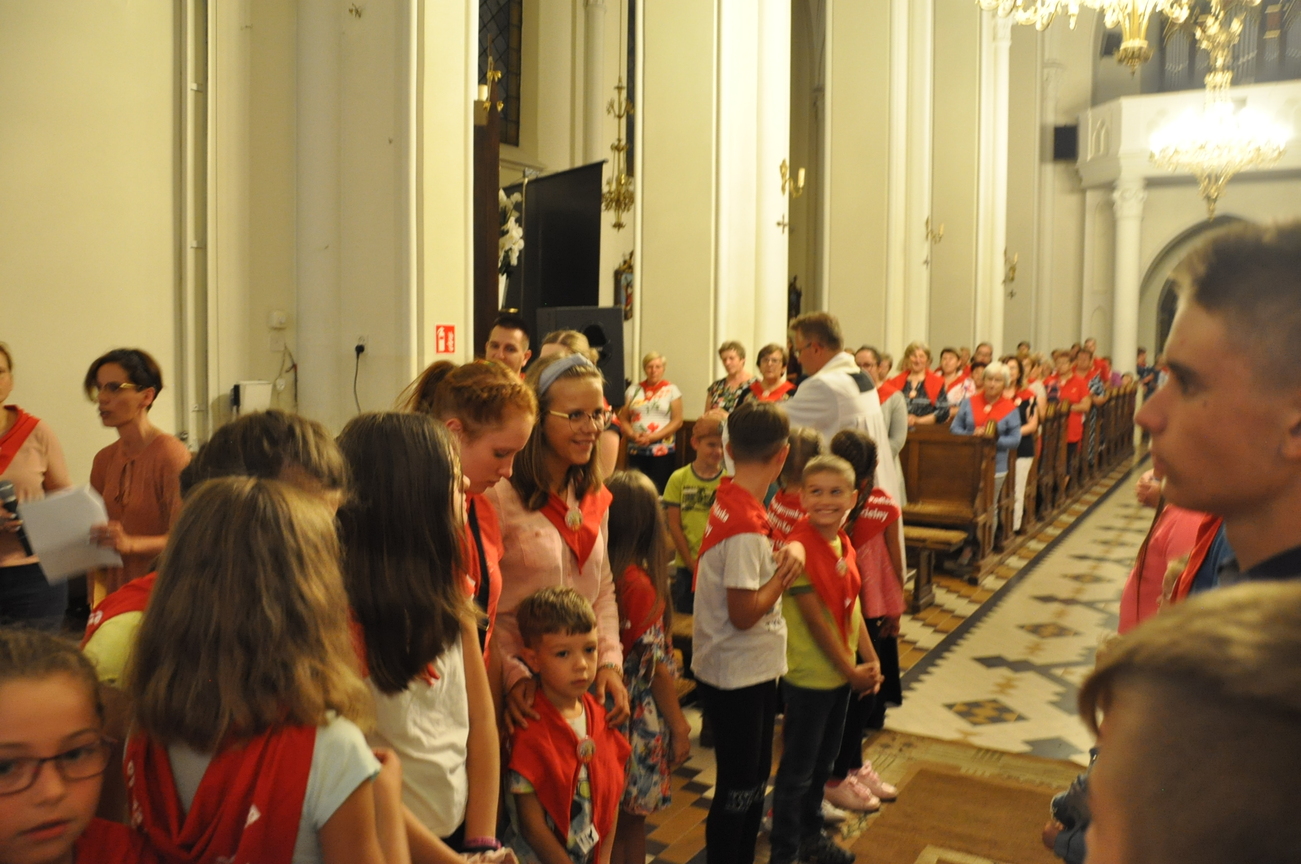 Anielskie głosy naszych najmłodszych pątników rozbrzmiewały w świątyni podczas rozważania radosnych tajemnic Różańca Świętego. Następnie ks. Sławomir udzielił dzieciom uroczystego błogosławieństwa z nałożeniem rąk.
