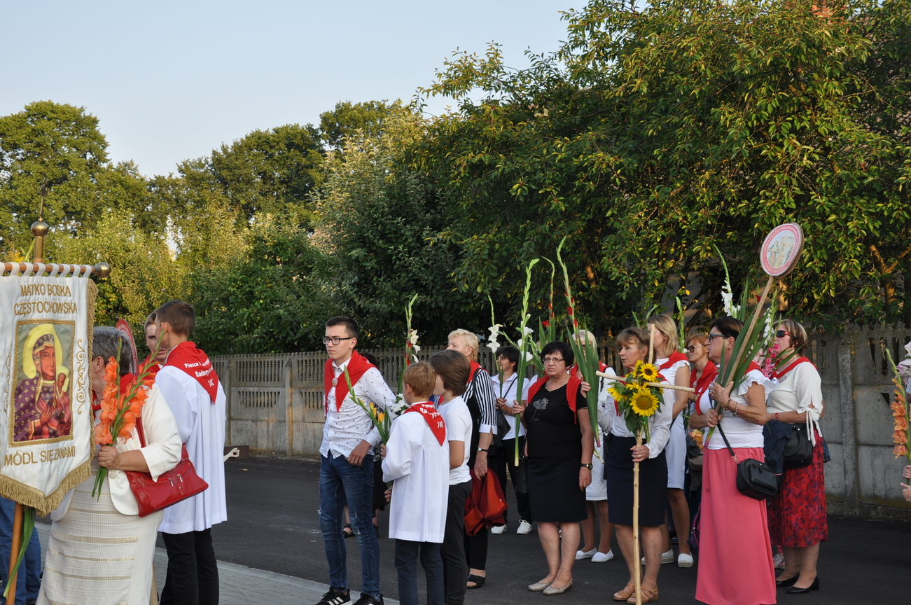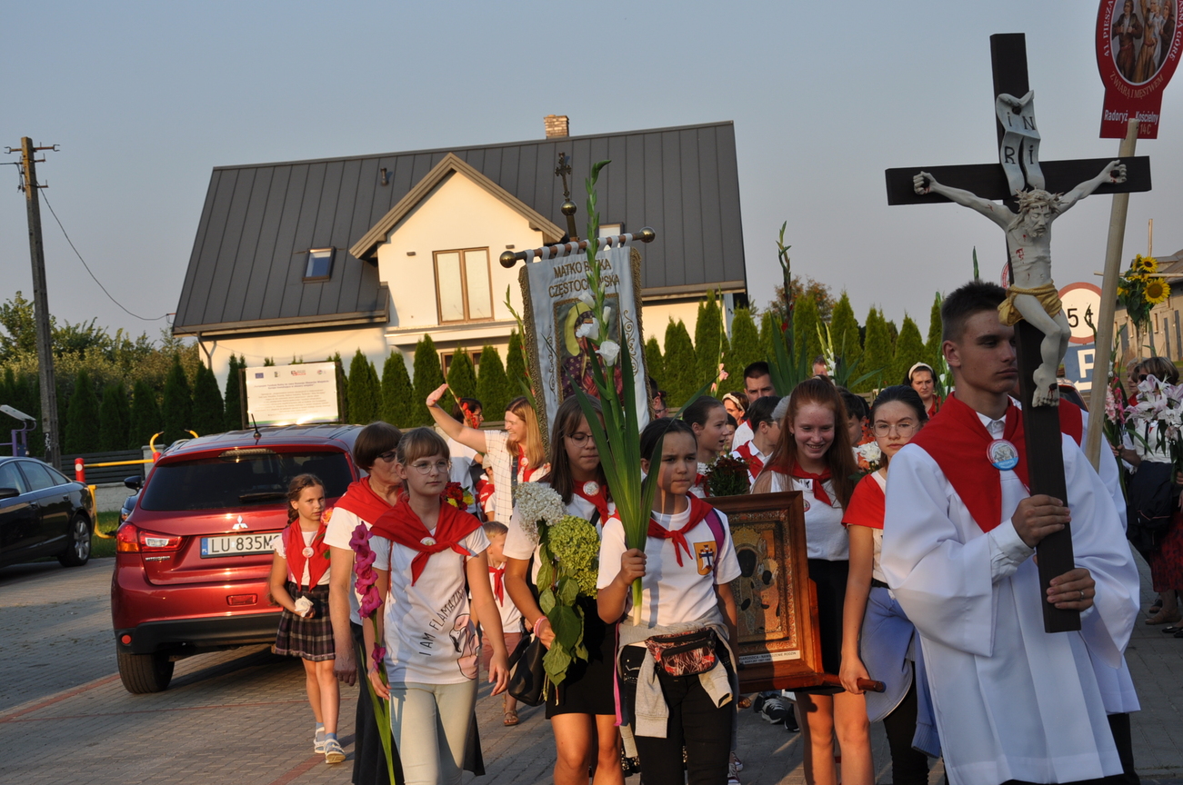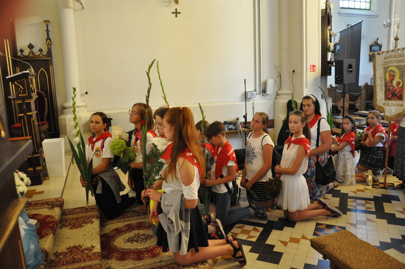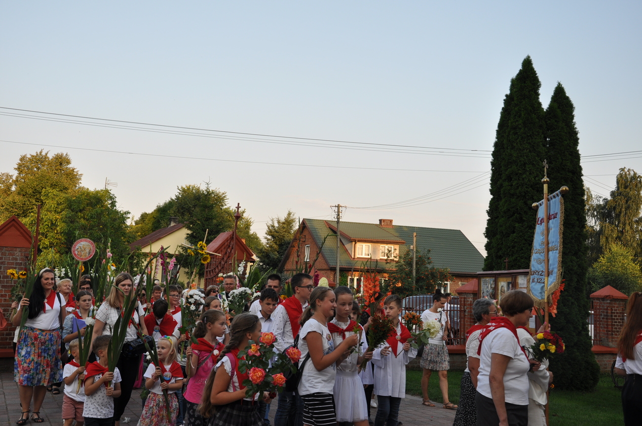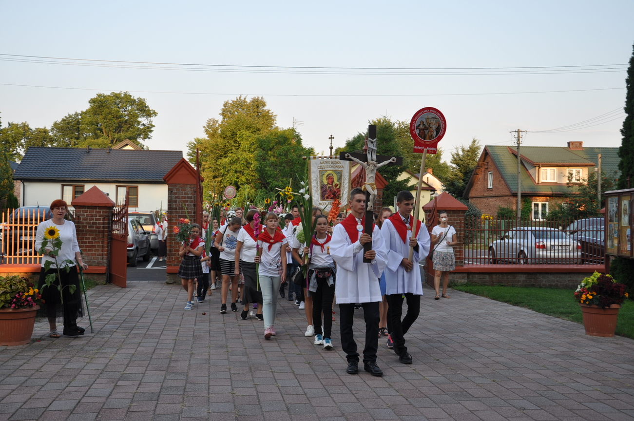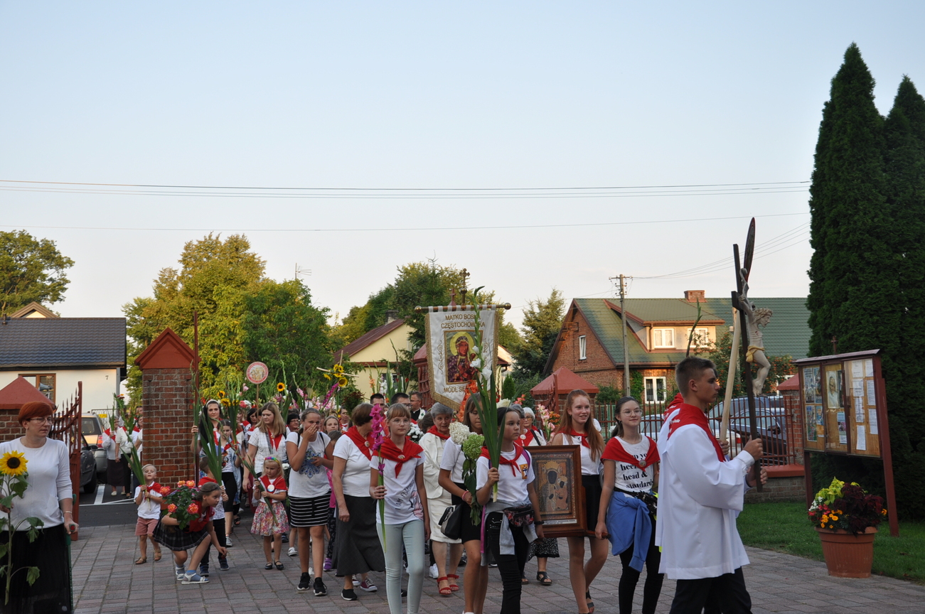 Dzisiaj ostatni etap naszej Duchowej Pielgrzymki. Zgromadziliśmy się przy Domu Strażaka z kwiatami aby procesyjnie wejść do kościoła niosąc kopię krzyża pratulińskiego, znaczek pielgrzymkowy, obraz i feretron z wizerunkiem Matki Bożej Częstochowskiej.