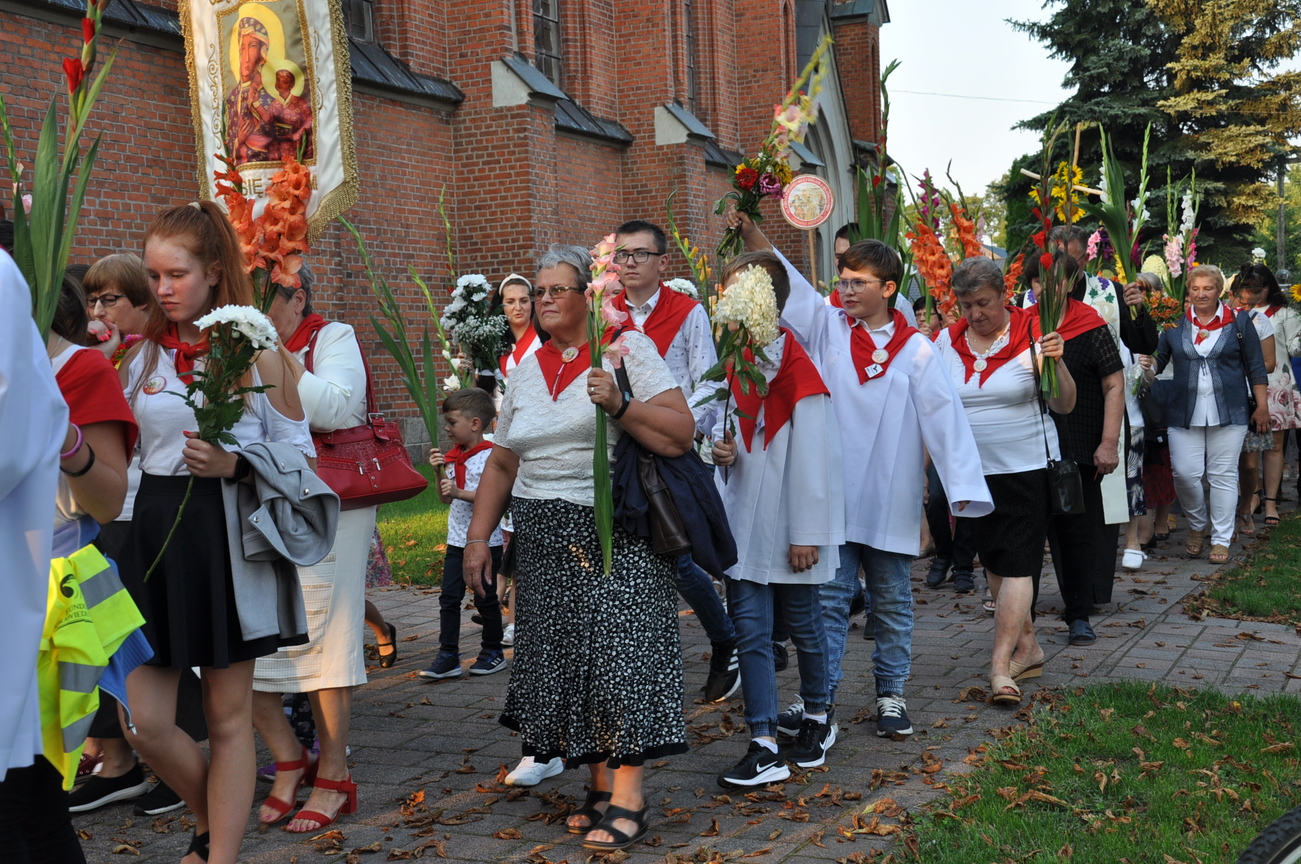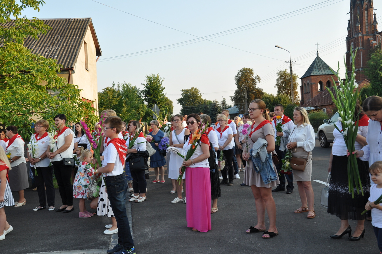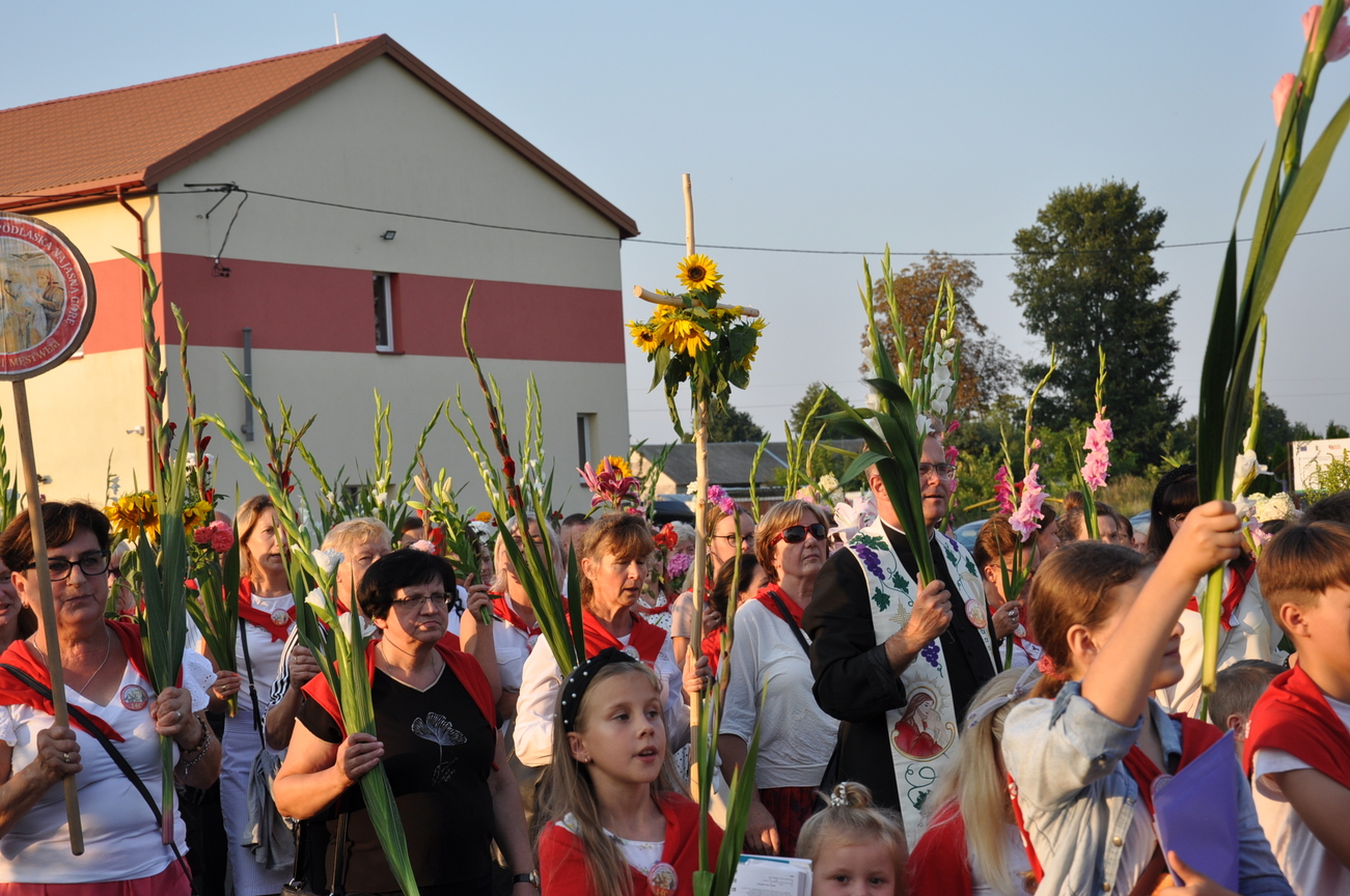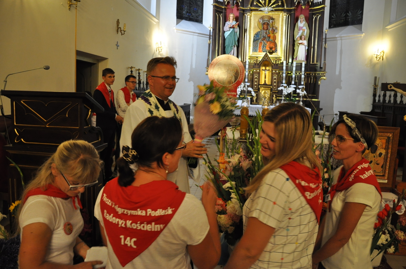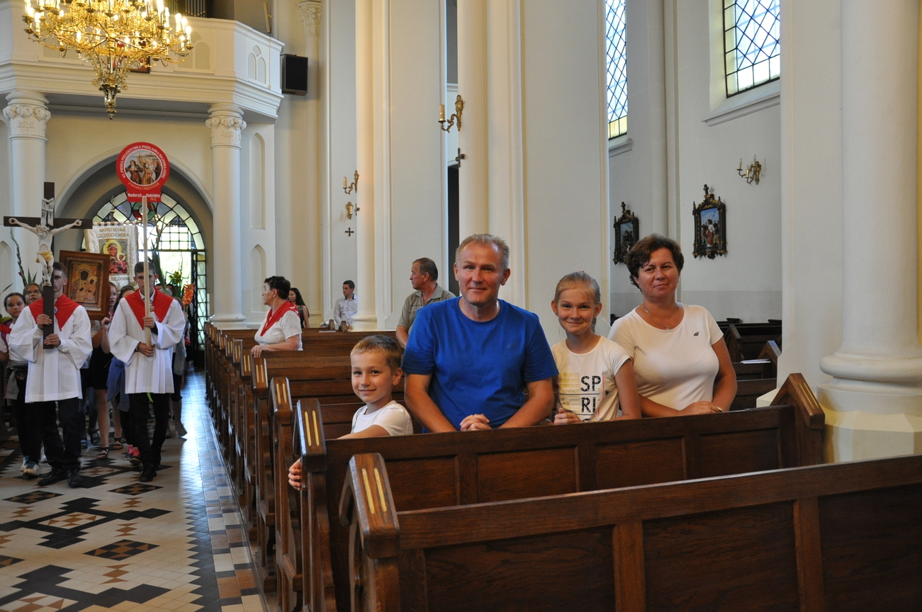 Dzisiaj ostatni etap naszej Duchowej Pielgrzymki. Zgromadziliśmy się przy Domu Strażaka z kwiatami aby procesyjnie wejść do kościoła niosąc kopię krzyża pratulińskiego, znaczek pielgrzymkowy, obraz i feretron z wizerunkiem Matki Bożej Częstochowskiej.