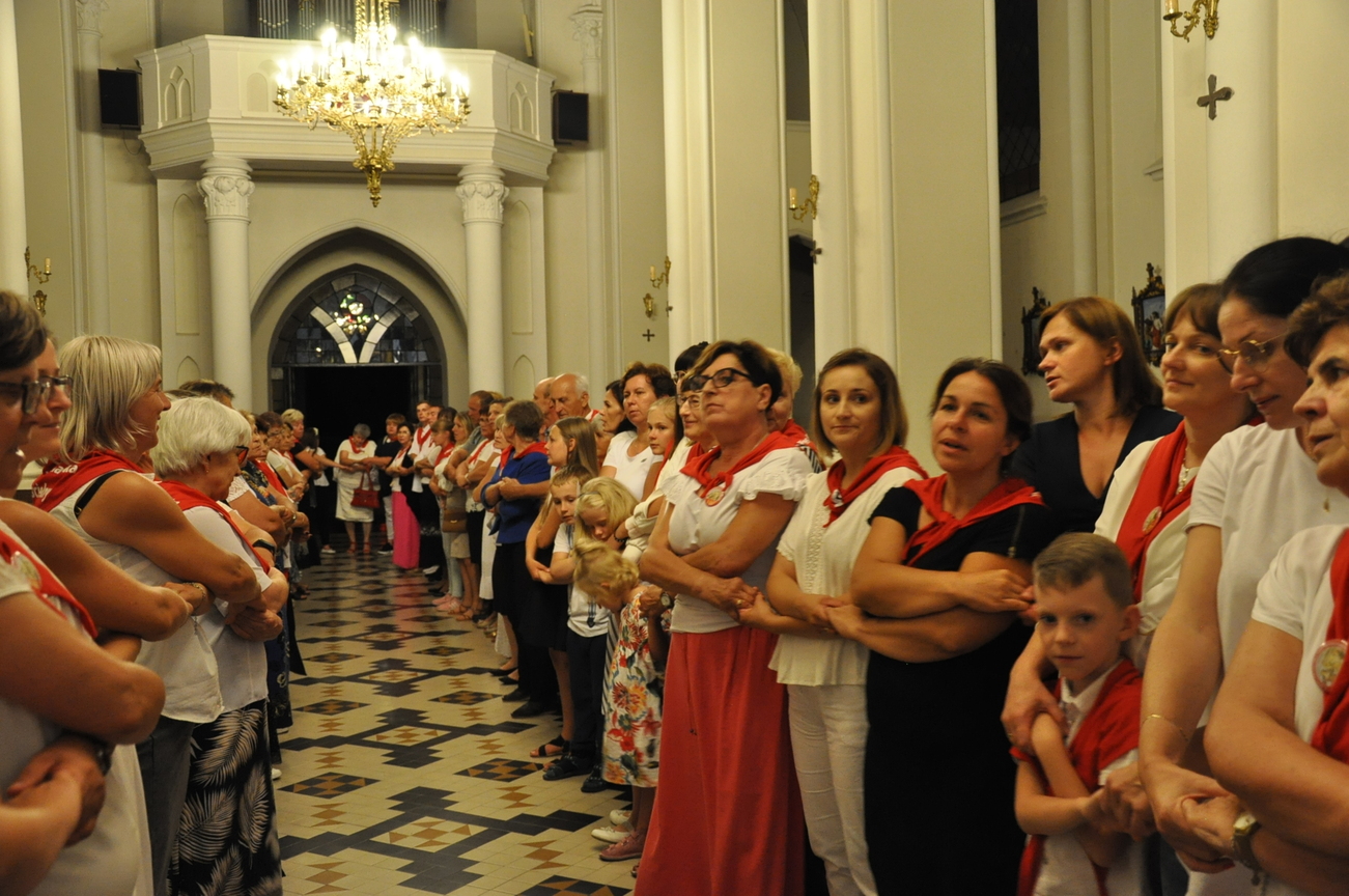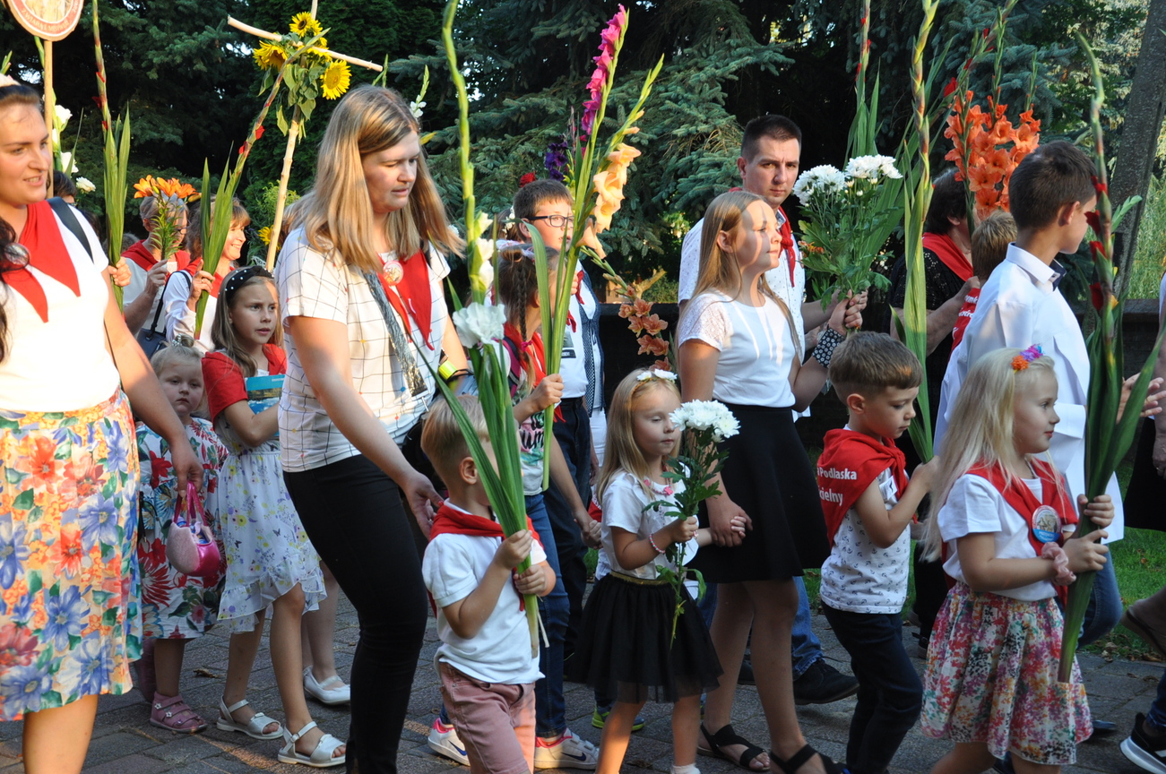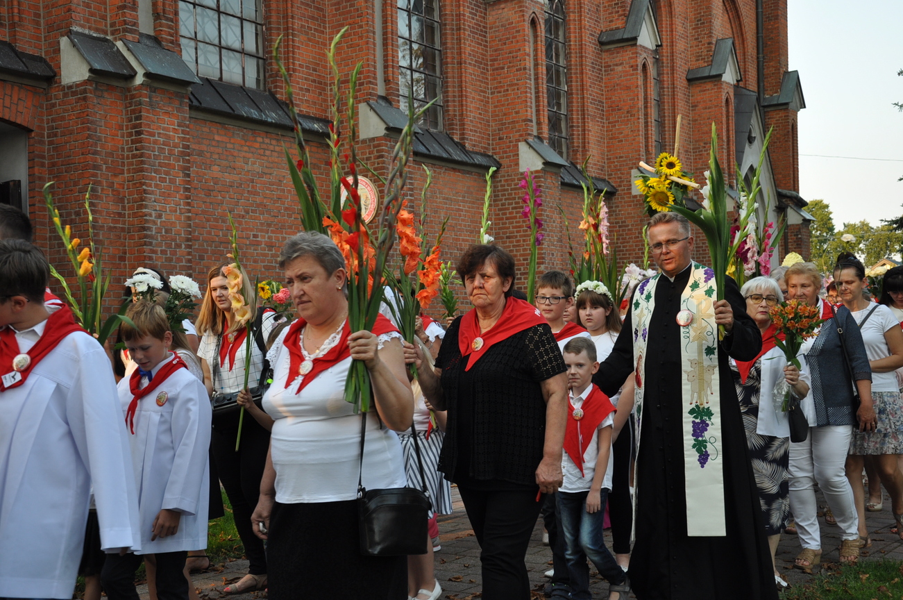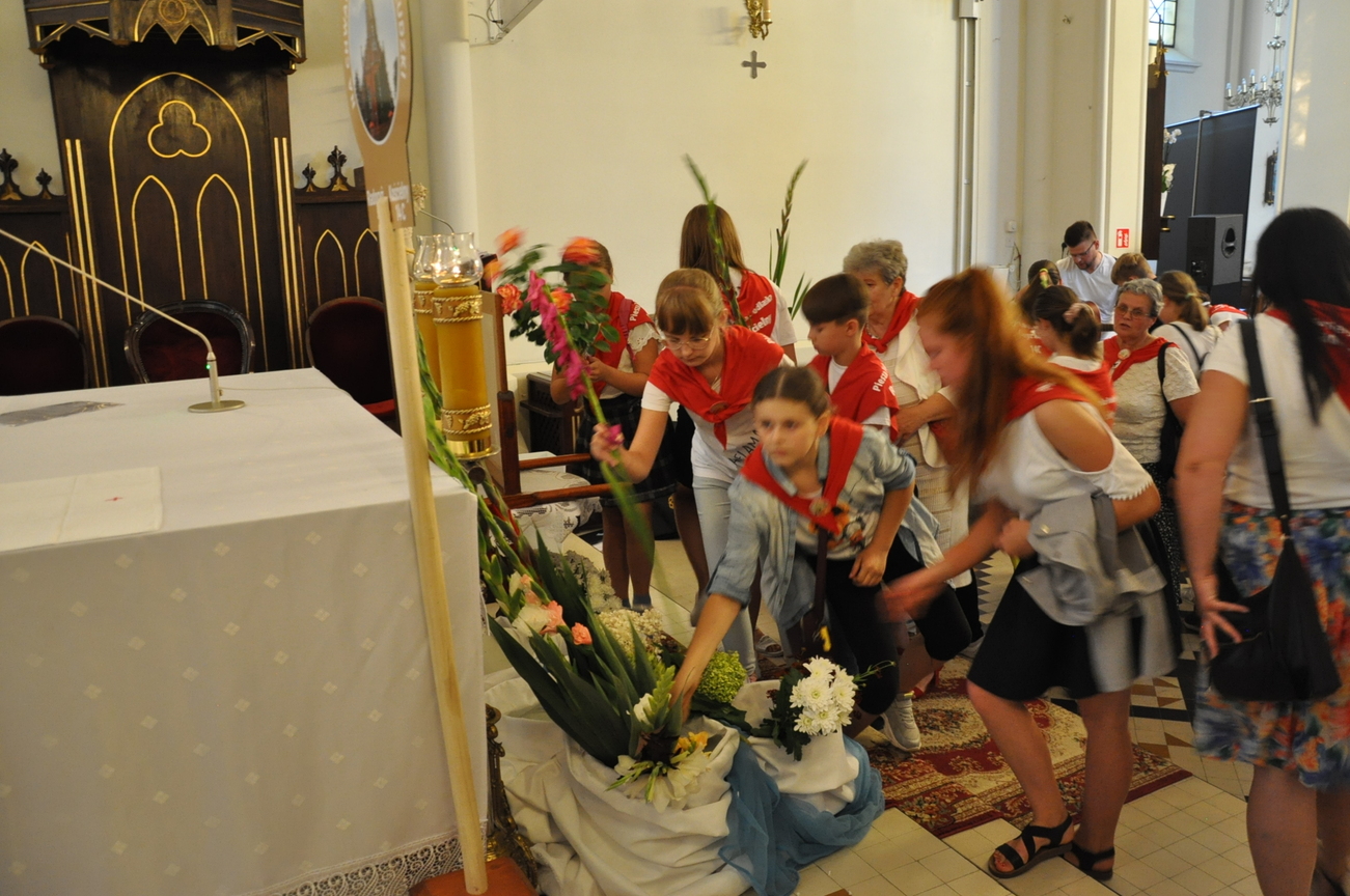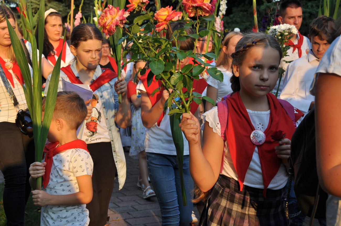 Dzisiaj ostatni etap naszej Duchowej Pielgrzymki. Zgromadziliśmy się przy Domu Strażaka z kwiatami aby procesyjnie wejść do kościoła niosąc kopię krzyża pratulińskiego, znaczek pielgrzymkowy, obraz i feretron z wizerunkiem Matki Bożej Częstochowskiej.
