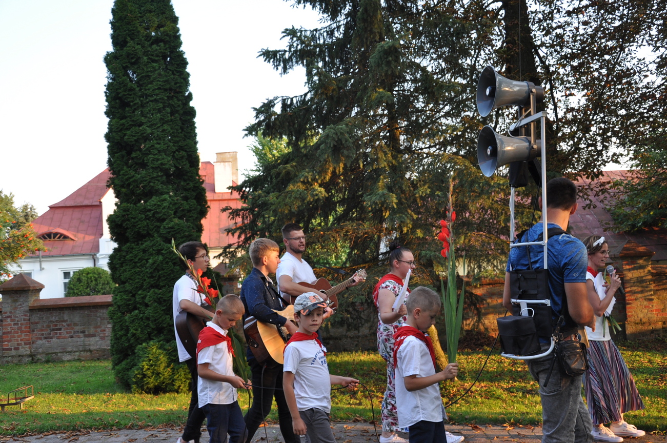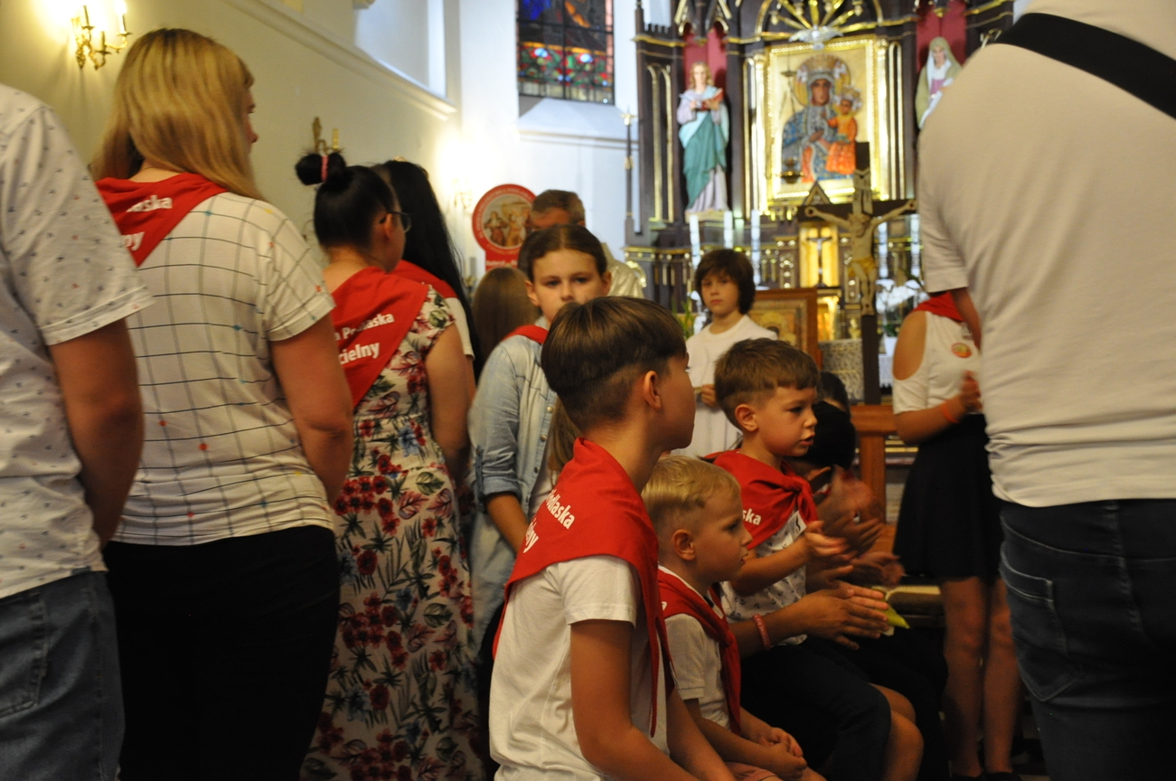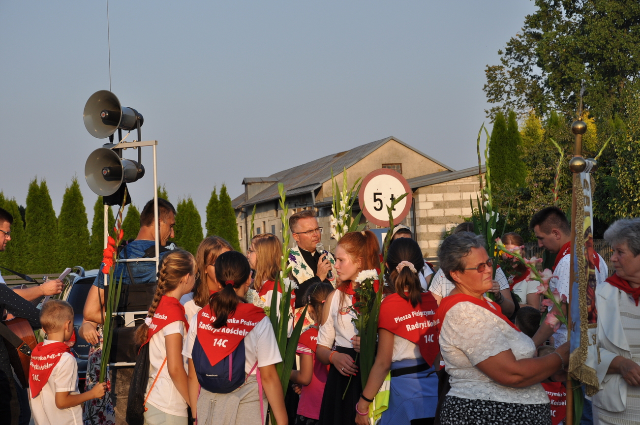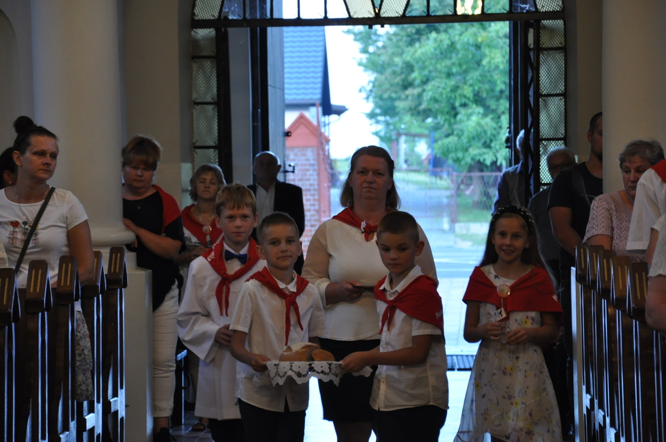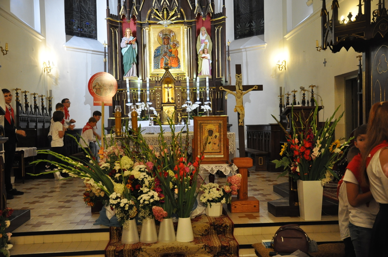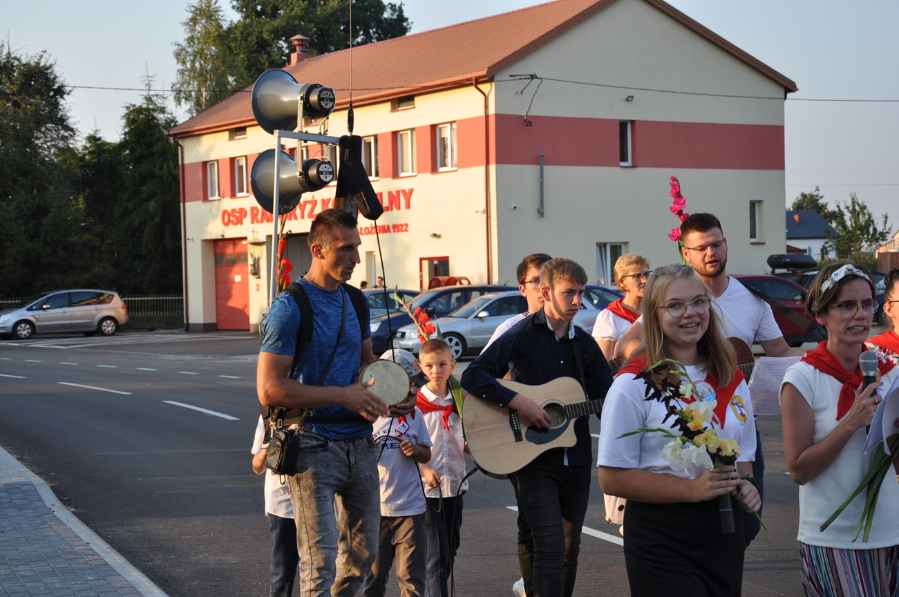 Dzisiaj ostatni etap naszej Duchowej Pielgrzymki. Zgromadziliśmy się przy Domu Strażaka z kwiatami aby procesyjnie wejść do kościoła niosąc kopię krzyża pratulińskiego, znaczek pielgrzymkowy, obraz i feretron z wizerunkiem Matki Bożej Częstochowskiej.