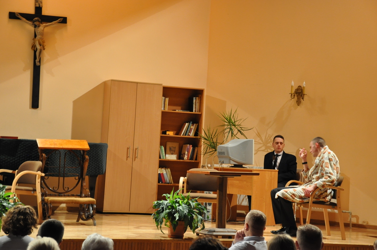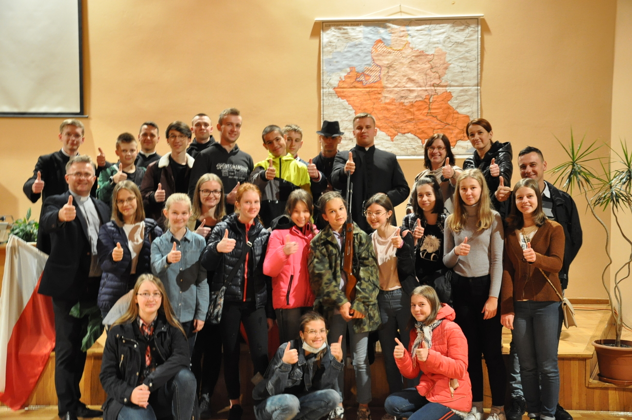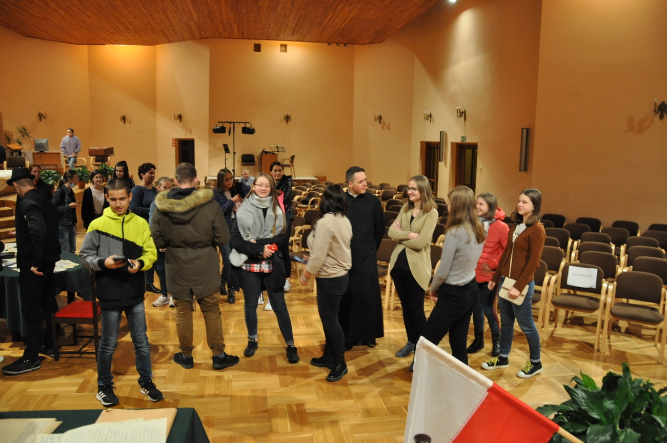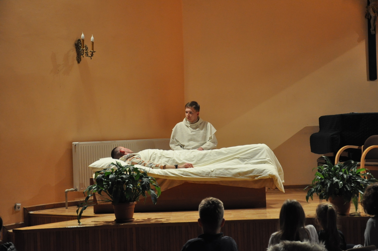 29.10.2021 młodzież razem z ks. Sławkiem wybrała się na sztukę seminaryjną. Ale… Od czego zaczyna się przygody? Od spotkania z Panem Bogiem na Eucharystii , tak też zrobiliśmy. Więc o 16.30 na mszy się spotkaliśmy, aby pomodlić się o udaną podróż. Na miejscu spotkaliśmy kleryka, reżysera, który przygotowywał sztukę o o. Józefie Marii Bocheńskim. W naszym Siedleckim Seminarium jest pewna tradycja, według której klerycy z trzeciego  roku wystawiają sztukę teatralną. Gdy sztuka się zaczęła wszyscy z zainteresowaniem i ciekawością wpatrywali się w bardzo dopracowane sceny odgrywane przez uzdolnionych teatralnie kleryków. Gdy przedstawienie się skończyło zapoznaliśmy się ze scenografią oraz zrobiliśmy sobie pamiątkowe zdjęcie grupowe z aktorami sztuki. Zostaliśmy także oprowadzeni po Seminarium i wstąpiliśmy do kaplicy, aby się pomodlić. W drodze powrotnej zahaczyliśmy o McDonalda na coś do jedzenia (oczywiście, bez mięsa). Wszyscy zadowoleni wróciliśmy do naszych domów