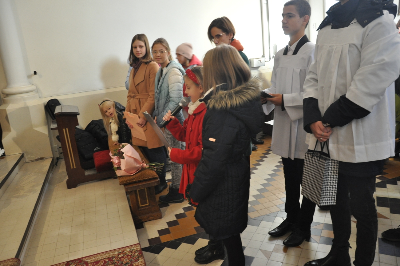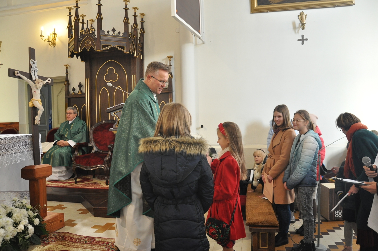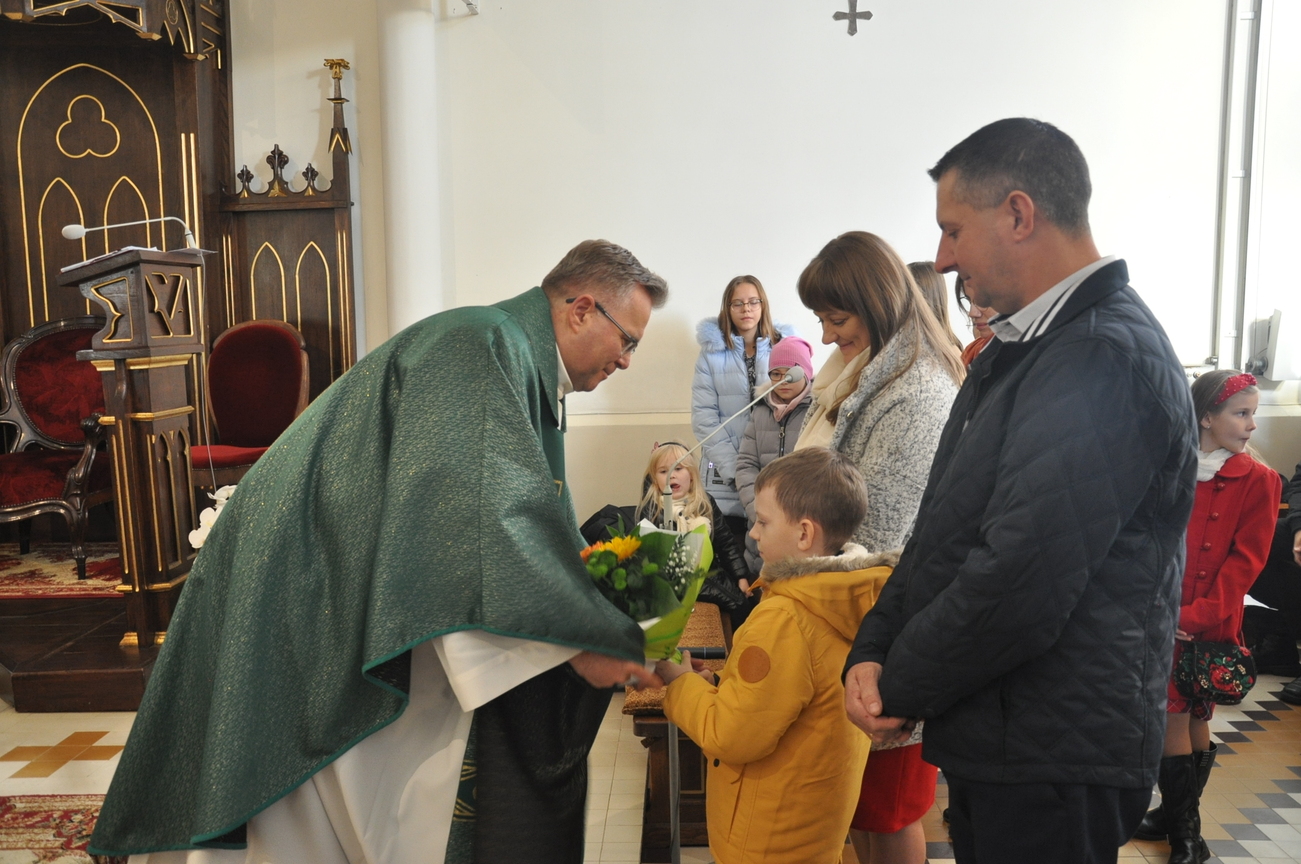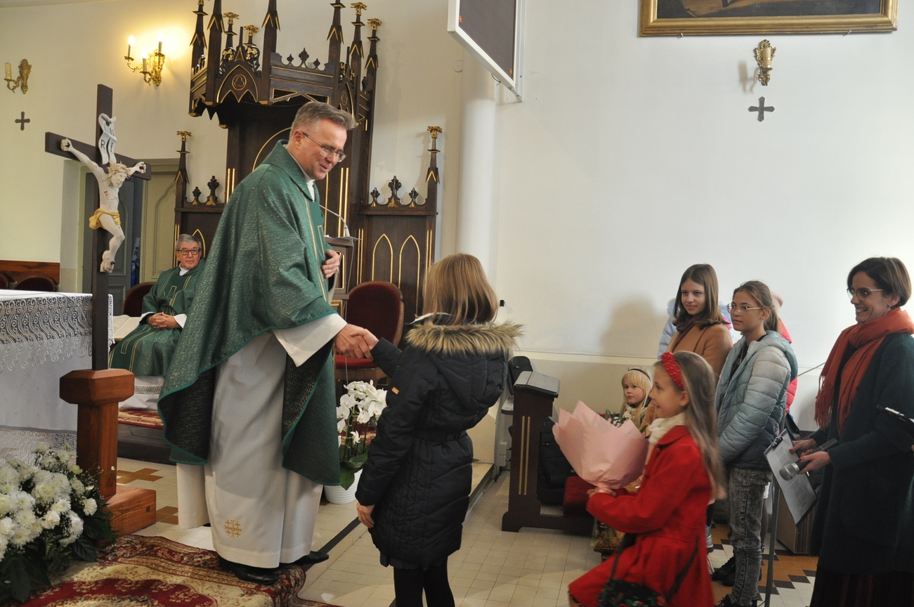 7 listopada na Mszy św. o godz. 10.15 modliliśmy się w intencji księdza wikariusza, który 5 listopada obchodził swoje imieniny. Poprzedzając liturgie przedstawiciele grup parafialnych złożyli najserdeczniejsze życzenia, życząc wiele zdrowia, anielskiej cierpliwości i niegasnącego uśmiechu przeszywającego serce, które zawsze jest gotowe nieść pomoc każdemu. Parafianie zapewnili o swojej modlitwie i prosili Matkę Bożą o opiekę nad księdzem. Po wspólnej Eucharystii było wystawienie Najświętszego Sakramentu i modlitwa różańcowa. Wychodząc z kościoła można było się poczęstować cukierkami imieninowymi u ministrantów. Zawsze to ludzie dają na tacę, a dzisiaj mogli z niej brać … ;-)